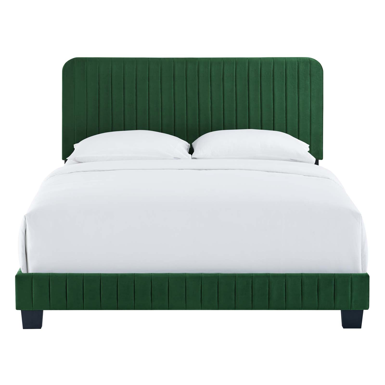 Elevate a teenager's bedroom or guest bedroom style with the luxe texture and glam deco elegance of the Celine Full Platform Bed. Adorned with channel tufted detail, the full size headboard of this upholstered bed is padded in dense foam to offer supportive comfort while sitting up resting, relaxing, reading, or watching TV. Upholstered in stain-resistant performance velvet, this platform bed eliminates the need for a box spring with a wood slat support system to allow for ample air circulation and a reinforced center beam and support legs for added durability. A sturdy mattress foundation, this full size platform bed accommodates a variety of mattress styles including innerspring, memory foam, and latex. Assembly required. Weight Limit: 800 lbs. Set Includes: One - Celine Channel Tufted Performance Velvet Full Platform Bed