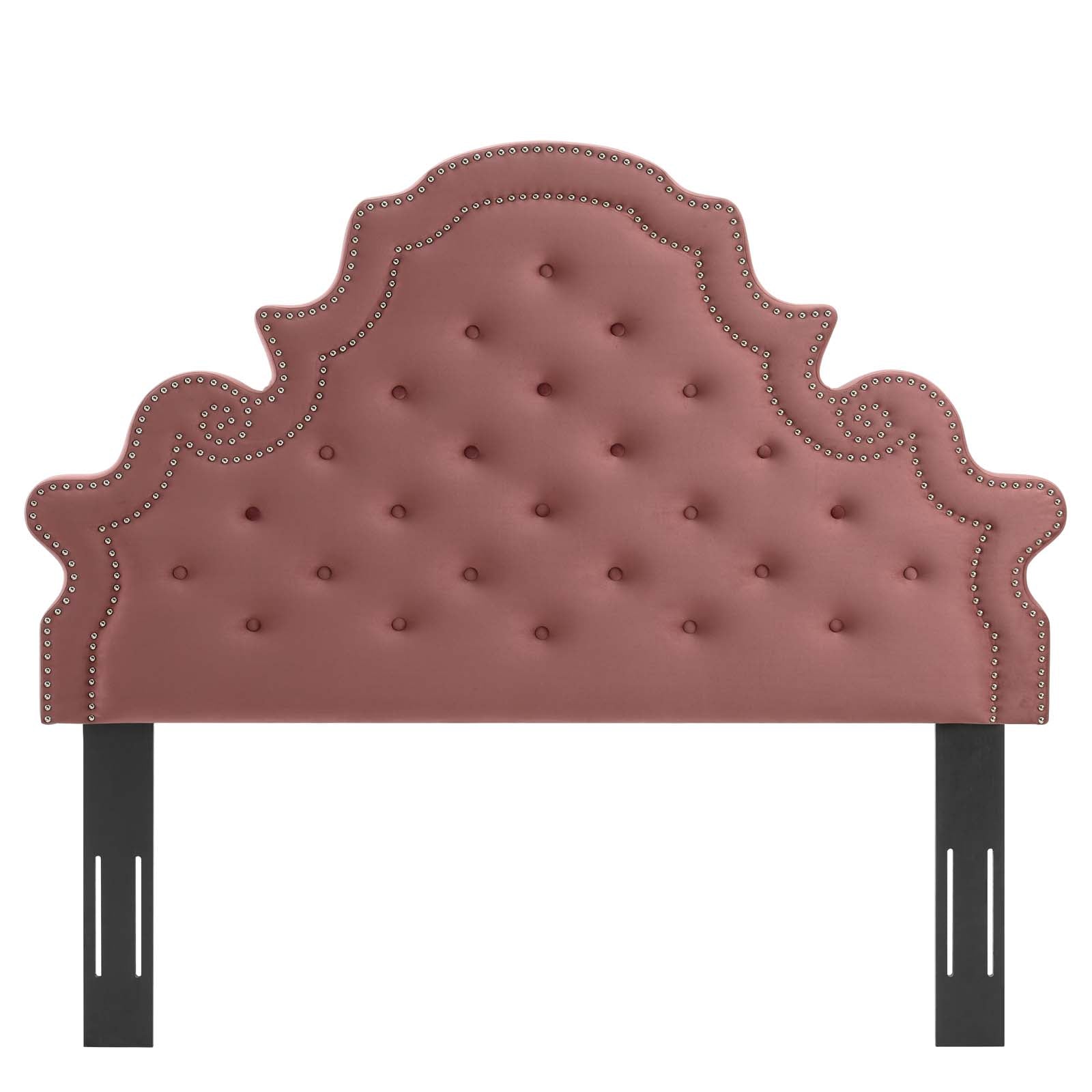 Elaborate details exude regal luxury and vintage glamour on the Diana Tufted Performance Velvet King/California King Headboard. Featuring classic button tufting and nailhead trim framing the avant garde silhouette, this king/Cali king headboard is a stunning addition to a master bedroom or guest bedroom. Upholstered in soft, stain-resistant performance velvet, this padded headboard offers supportive comfort while sitting up in bed reading, relaxing, or watching TV. With various mounting positions, this height-adjustable headboard fits European king or California king bed frames. Assembly required. Set Includes: One - Diana Tufted Performance Velvet King/California King Headboard