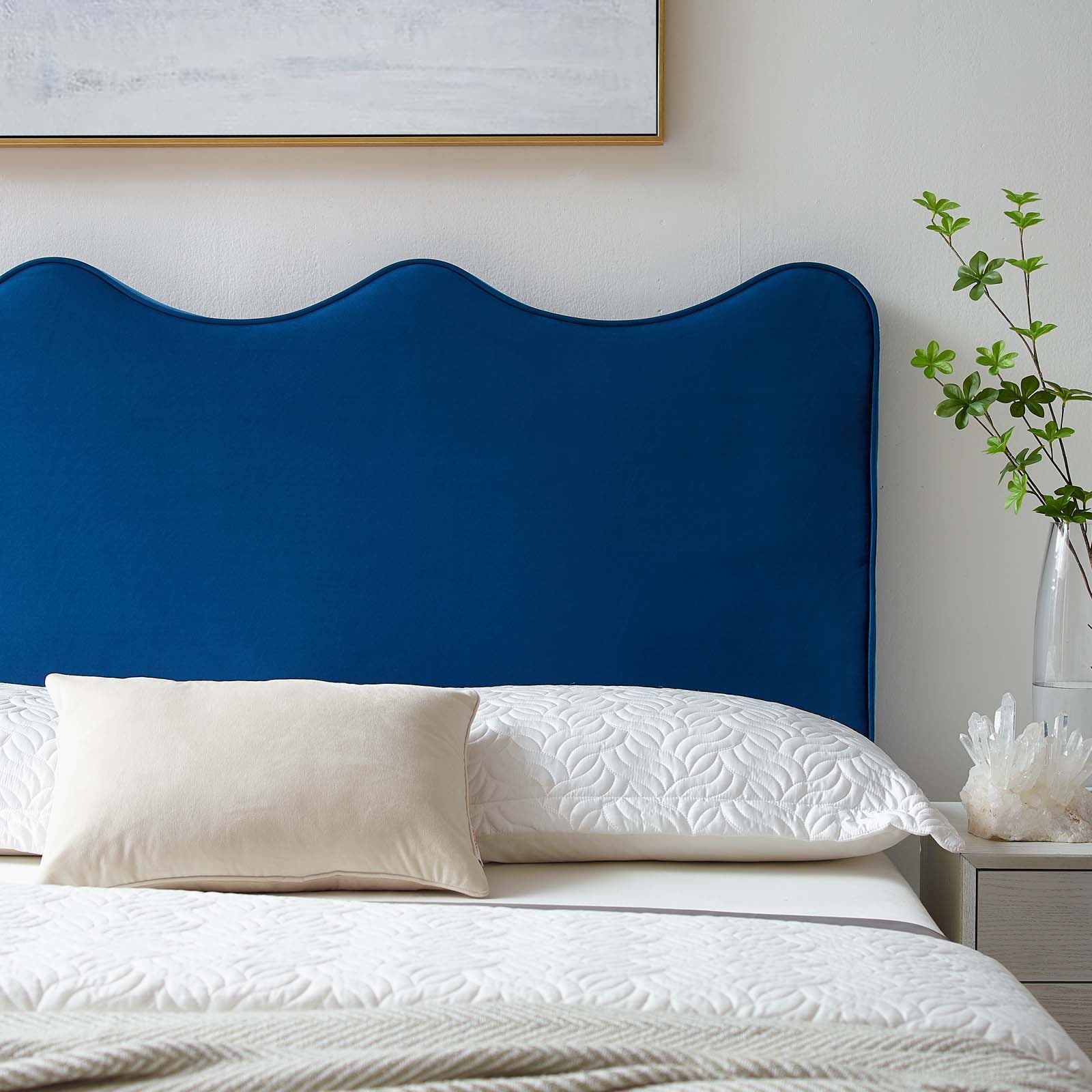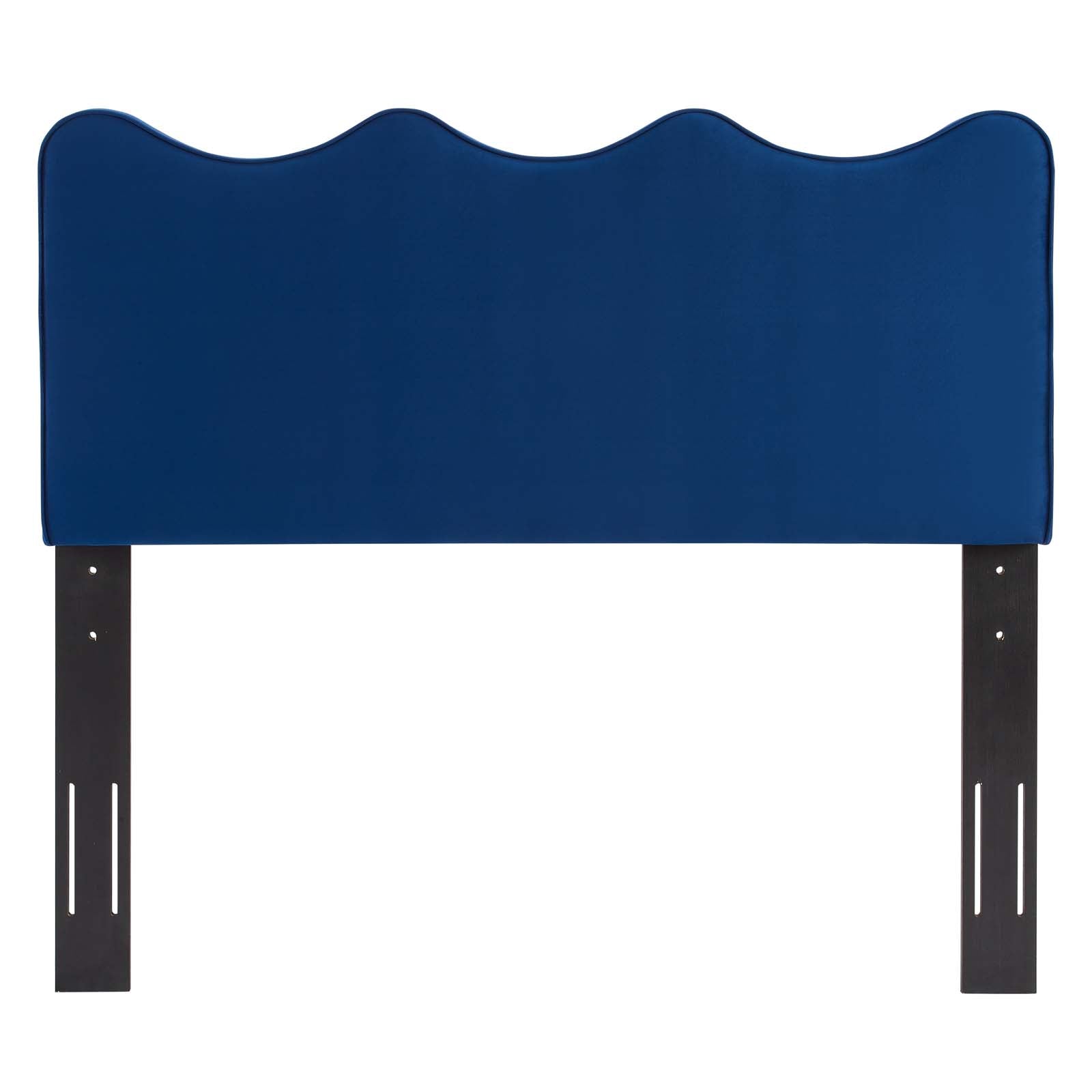 Incorporate the movement of the sea into your master bedroom or guest suite with the Athena Performance Velvet King/California King Headboard. Putting a modern twist on a classic scalloped design, this king or California king sized headboard features luxe texture and a silhouette inspired by the ocean waves. Covered in stain-resistant performance velvet, this upholstered headboard is complete with dense foam padding to offer a supportive place to sit back and relax while watching TV, resting, or reading in bed. With a frame crafted from MDF and plywood, this adjustable headboard for Cali king or king bed frames has multiple mounting positions. Assembly required. Set Includes: One - Athena King/California King Headboard