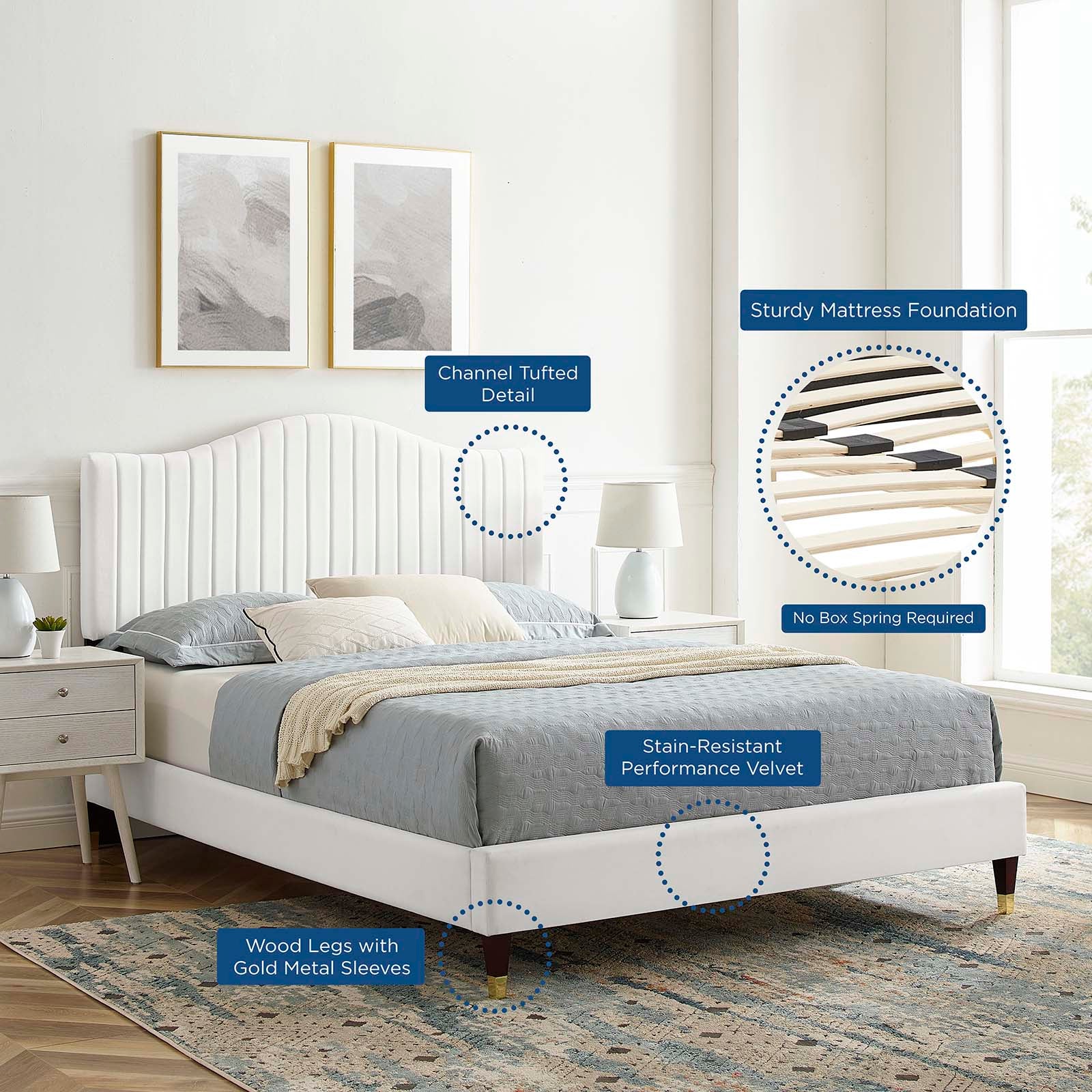 Bring opulent style to the bedroom with the Juniper Performance Velvet Platform Bed. The channel tufting, sweeping curved silhouette, and rich texture of the king size headboard introduces glam deco style and vintage modernity to a master bedroom or guest suite. A king size bed frame covered in stain-resistant performance velvet, this upholstered bed frame is a sturdy mattress foundation for memory foam, innerspring, latex, and hybrid mattresses. Eliminating the need for a box spring, the MDF frame of this king bed is complete with a wood slat support system crafted with poplar for lasting durability and support. This slatted bed frame rests on wood legs with gold metal sleeves and non-marking foot caps and includes a reinforced center beam with two support legs for enhanced stability. Assembly required. King Bed Weight Capacity: 800 lbs. Set Includes: One - Brielle Channel Tufted King/California King Headboard One - Harlow King Platform Bed Frame
