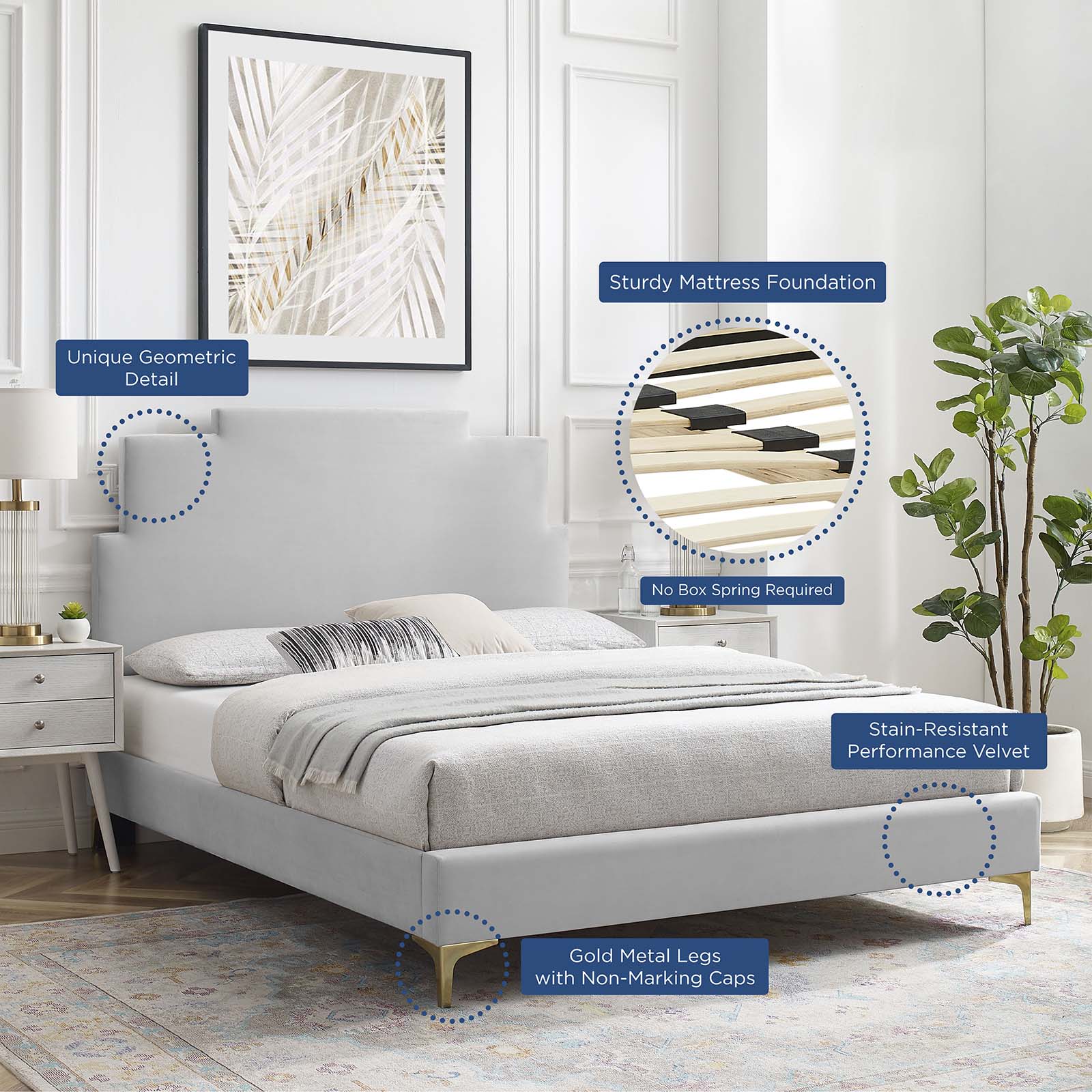 Elevate the style in a guest bedroom or kid's bedroom with the Lindsey Performance Velvet Twin Platform Bed. The padded headboard of this twin size bed features luxe texture, clean lines, and escalating silhouette. Rich in glam deco style and vintage modern elegance, this upholstered bed is covered in stain-resistant performance velvet and is a sturdy mattress foundation for memory foam, innerspring, latex, and hybrid mattresses. Eliminating the need for a box spring, the MDF frame of this twin platform bed is complete with a wood slat support system crafted with poplar for lasting durability and support. This slatted bed frame rests on gold metal legs with non-marking foot caps and includes a reinforced center beam with two support legs for enhanced stability. Assembly required. Twin Bed Weight Capacity: 800 lbs. Set Includes: One - Kasia Twin Headboard One - Sutton Twin Bed Frame