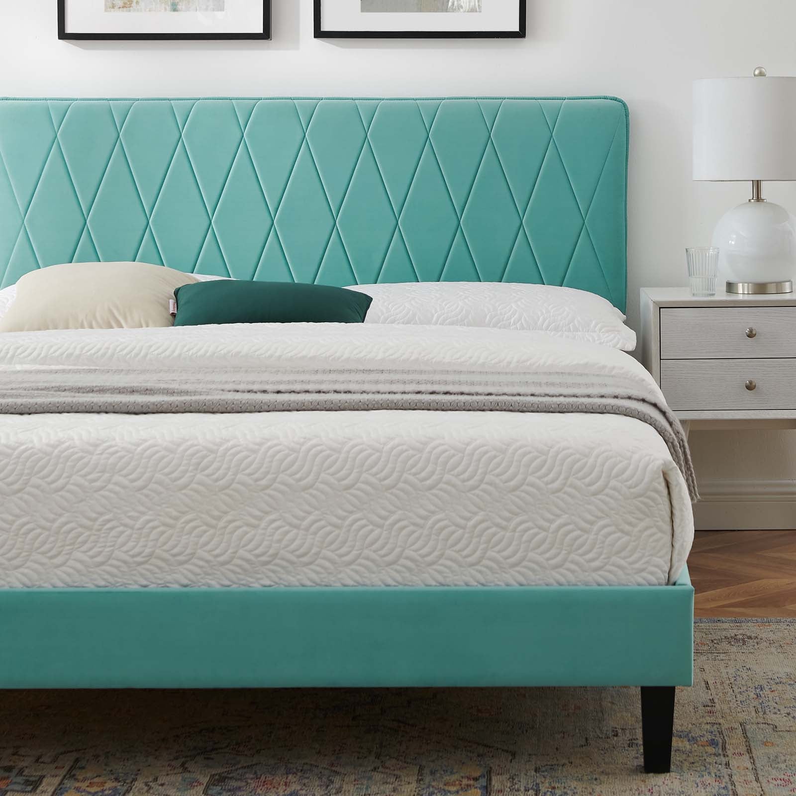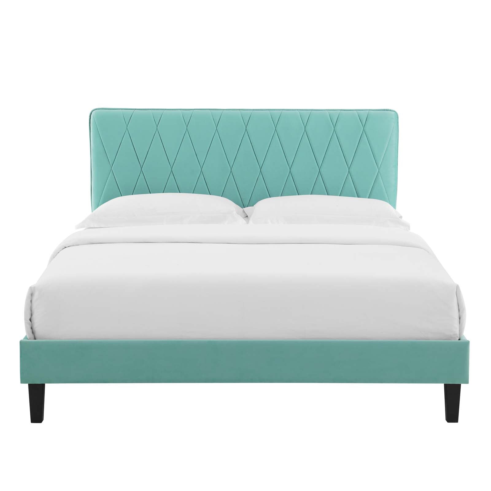 Offer glam deco style and vintage modern elegance to a teenager's bedroom or guest bedroom decor with the Phillipa Performance Velvet Full Platform Bed. The padded headboard of this full size bed features a beautiful intersecting diamond design. Rich in glam deco style and vintage modern elegance, this upholstered bed is covered in stain-resistant performance velvet and is a sturdy mattress foundation for memory foam, innerspring, latex, and hybrid mattresses. Eliminating the need for a box spring, the MDF frame of this full platform bed is complete with a wood slat support system crafted with poplar for lasting durability and support. This slatted bed frame rests on black wood legs with non-marking foot caps and includes a reinforced center beam with two support legs for enhanced stability. Assembly required. Full Bed Weight Capacity: 800 lbs. Set Includes: One - Leila Full/Queen Headboard One - Reign Full Platform Bed Frame