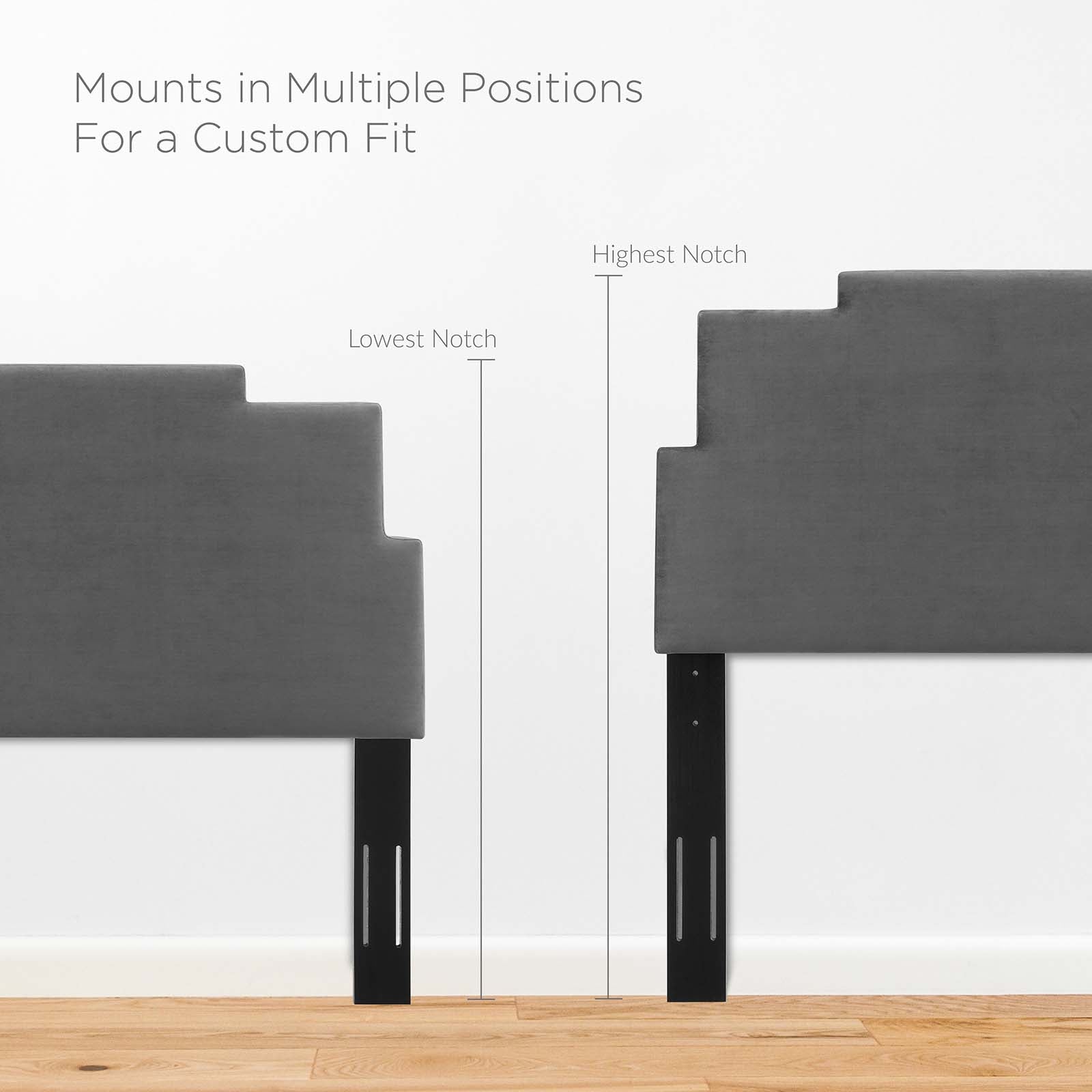 Elevate the style in your master bedroom or guest bedroom with the Lindsey Performance Velvet King Platform Bed. The padded headboard of this king size bed features luxe texture, clean lines, and escalating silhouette. Rich in glam deco style and vintage modern elegance, this upholstered bed is covered in stain-resistant performance velvet and is a sturdy mattress foundation for memory foam, innerspring, latex, and hybrid mattresses. Eliminating the need for a box spring, the MDF frame of this king platform bed is complete with a wood slat support system crafted with poplar for lasting durability and support. This slatted bed frame rests on black wood legs with non-marking foot caps and includes a reinforced center beam with two support legs for enhanced stability. Assembly required. King Bed Weight Capacity: 800 lbs. Set Includes: One - Kasia King/California King Headboard One - Reign King Platform Bed Frame