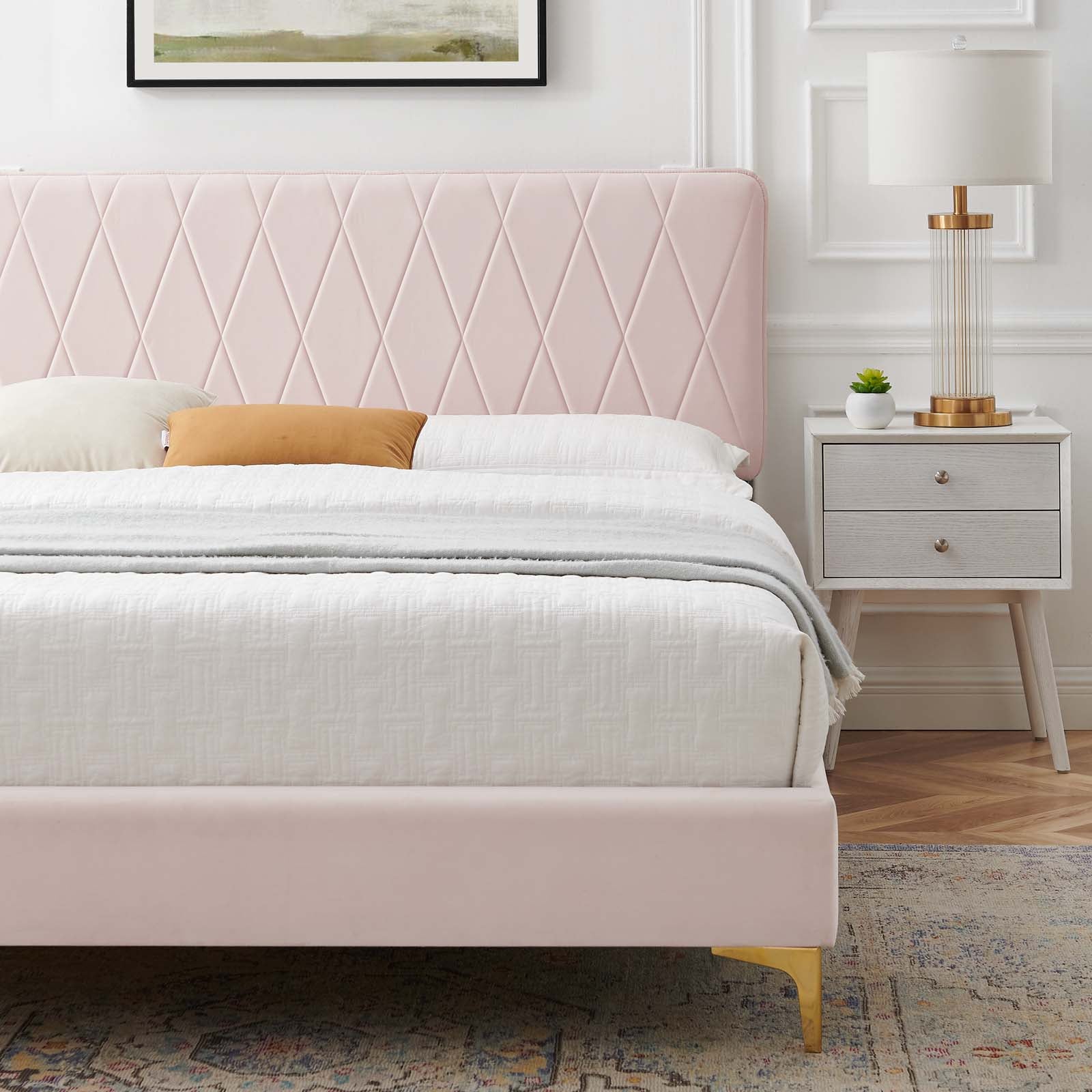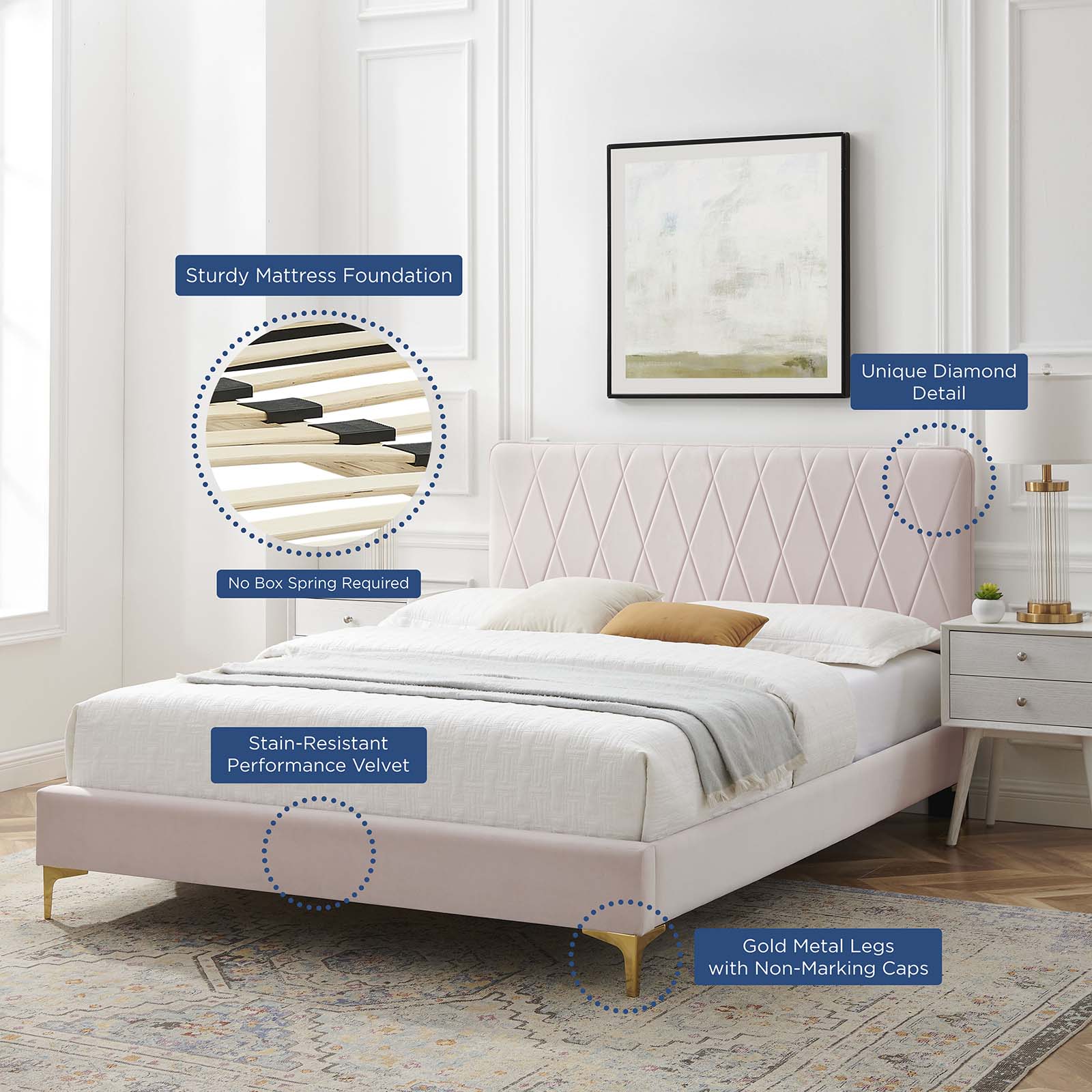 Offer glam deco style and vintage modern elegance to your master bedroom or guest bedroom decor with the Phillipa Performance Velvet King Platform Bed. The padded headboard of this king size bed features a beautiful intersecting diamond design. Rich in glam deco style and vintage modern elegance, this upholstered bed is covered in stain-resistant performance velvet and is a sturdy mattress foundation for memory foam, innerspring, latex, and hybrid mattresses. Eliminating the need for a box spring, the MDF frame of this king platform bed is complete with a wood slat support system crafted with poplar for lasting durability and support. This slatted bed frame rests on gold metal legs with non-marking foot caps and includes a reinforced center beam with two support legs for enhanced stability. Assembly required. King Bed Weight Capacity: 800 lbs. Set Includes: One - Leila King/California King Headboard One - Sutton King Bed Frame