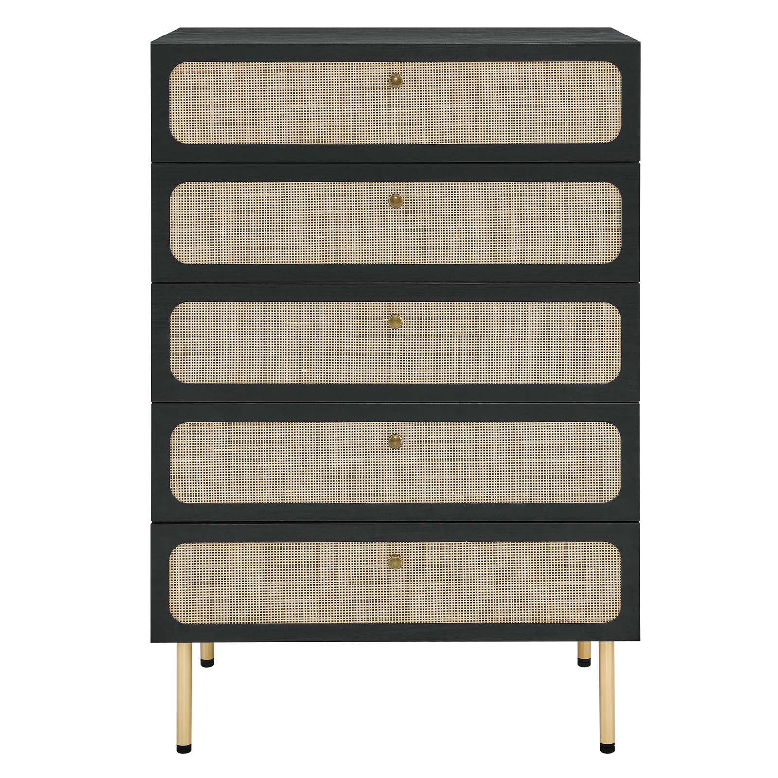 Refresh a bedroom with the textured detail of the Chaucer 5-Drawer Chest. Featuring beautiful oval rattan on the drawer fronts, this 5-drawer chest updates a primary bedroom or guest room. Five spacious full-extension drawers offer ample storage space for clothes, linens, and more. Resting on adjustable feet with non-marking pads, this chest of drawers is durably crafted with particleboard and a wood grain laminate to bring natural organic aesthetics to your bedroom decor. Assembly required. Set Includes: One - Chaucer 5-Drawer Chest