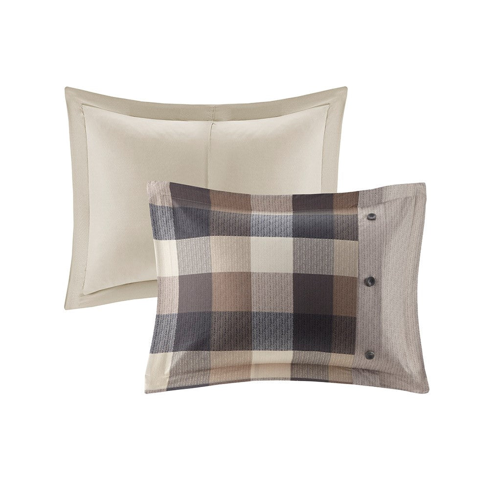 For an irresistibly warm and comfortable look, Madison Parks Ridge 7 Piece Herringbone Comforter Set is the perfect update to your bed. This comforter sports a buffalo plaid pattern printed on herringbone fabric, for a cabin-inspired look. The bold design gives way to a printed herringbone border at the foot of the bed, adding a charming touch. Coordinating shams mimic the style of the comforter, enhancing the warm and cozy lodge aesthetic. Three decorative pillows with hand-stitched embroidered details bring texture and dimension to the top of the bed, while the print herringbone bed skirt offers a clean and handsome finish.