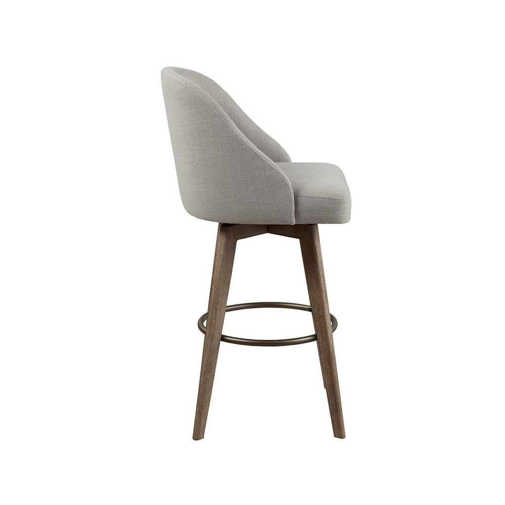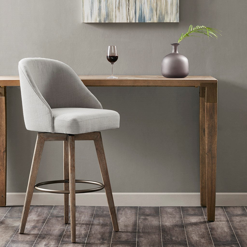 Beautifully crafted, the Madison Park Pearce Barstool with Swivel Seat introduces a perfect blend of simplicity and sophistication. This barrel style counter stool features a swivel function, allowing you to easily rotate the rectangular seat. Soft grey upholstery and a smooth reclaimed grey finish on the rubber wood legs create a clean transitional look, while a matt silver metal ring provides the perfect footrest. The smooth and graceful curves of this counter stool form an elegant silhouette that adds a handsome touch to your dining room. Assembly is required. Max weight capacity: 300 lbs.