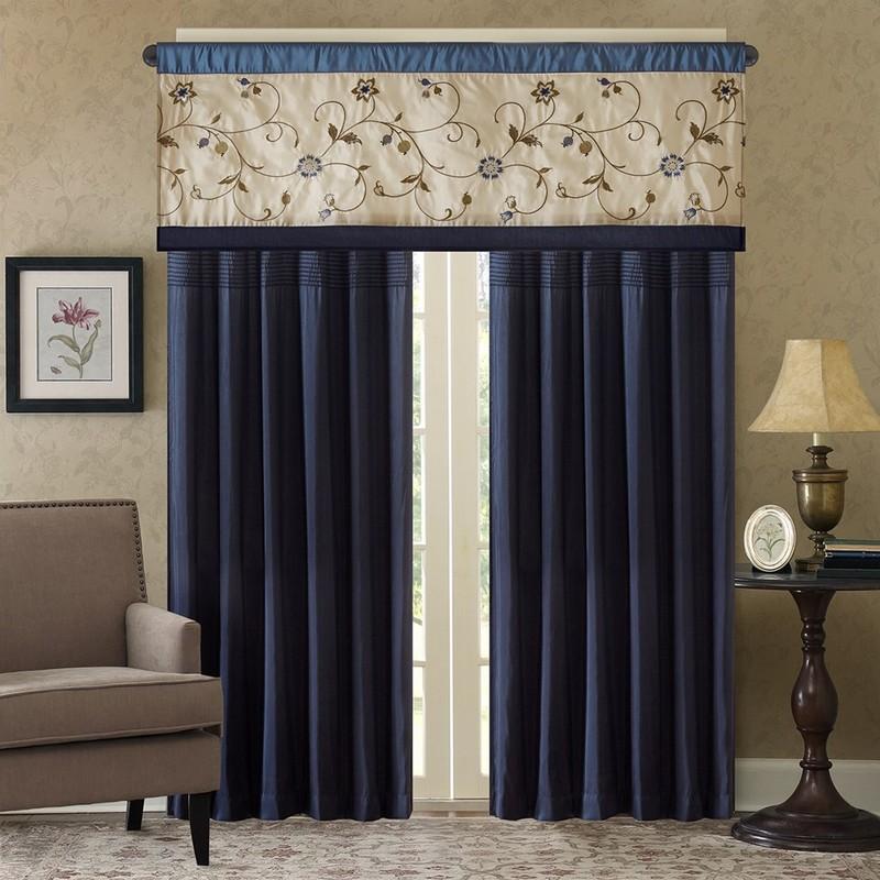 Add simple elegance to any room with the Serene window valance. The deep navy color combined with soft ivory and chocolate brown creates the perfect classic look. The valance features delicate floral embroidery and lining to help filter light and provide some room darkening features. Valance is made with 3" rod pocket and fits up to 1.25" diameter rod.
