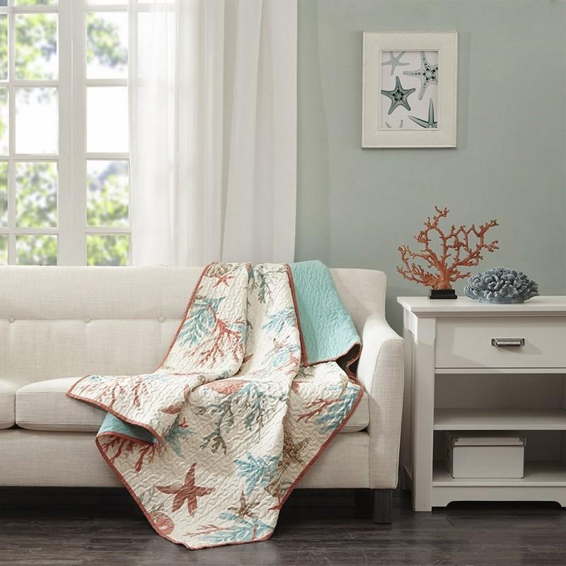 This Madison Park quilted throw creates a casual coastal look. The throw features starfish and coral motifs accentuated with coral and aqua colors and reverses to an aqua blue. It's oversized and overfilled for added comfort and style.