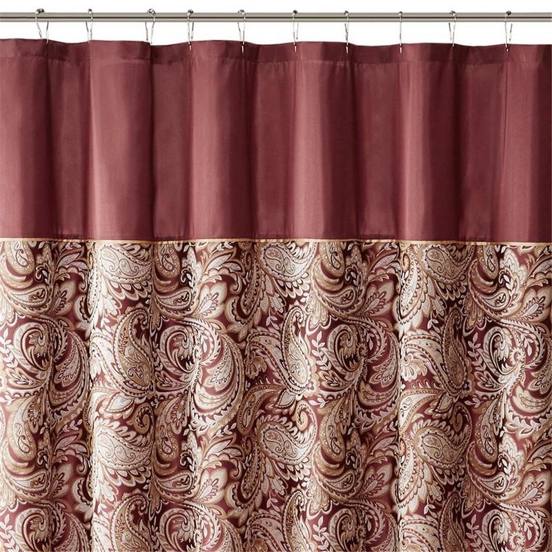 The Aubrey shower curtain is a beautiful woven jacquard in a paisley motif. The burgundy and gold in this curtain make it easy to coordinate with your towels and accessories.
