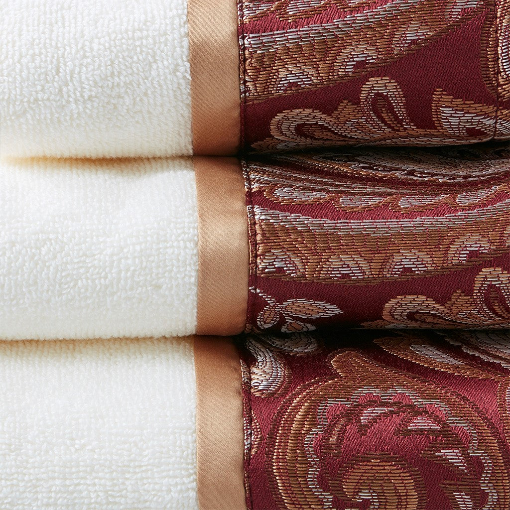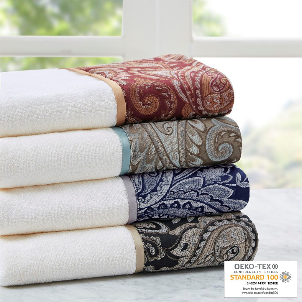 Add a sophisticated style to your bathroom with our Madison Park Aubrey 6 Piece Jacquard Towel Set. This towel set features a pieced design with a woven paisley jacquard hem, in soft burgendy and taupe hues, for an elegant and decorative touch. These cotton towels are also OEKO-TEX certified, meaning they do not contain any harmful substances, ensuring quality comfort and wellness. Made from 100% cotton terry, this towel set is incredibly soft, absorbent, and machine washable for easy care. Place these jacquard cotton towels in your bathroom to add the perfect finishing touches to your traditional style decor. Coordinating shower curtains and rugs are available and sold separately for a complete look. Set includes: 2 standard 27x52" bath towels, 2 standard 16x28" hand towels, and 2 standard 12x18" fingertip towels.