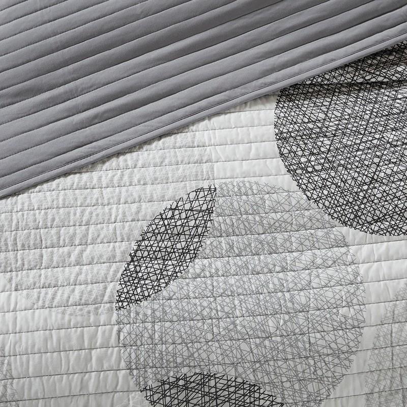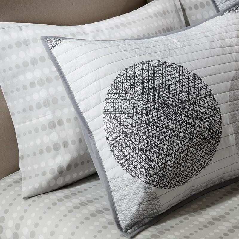 Knowles instantly updates your bedroom for a clean modern look. A circular print in different shades of gray covers this soft gray coverlet. Made from microfiber polyester and is machine washable for easy care. The set includes two standard shams, one embroidered decorative pillow, and a coordinating sheet set.
