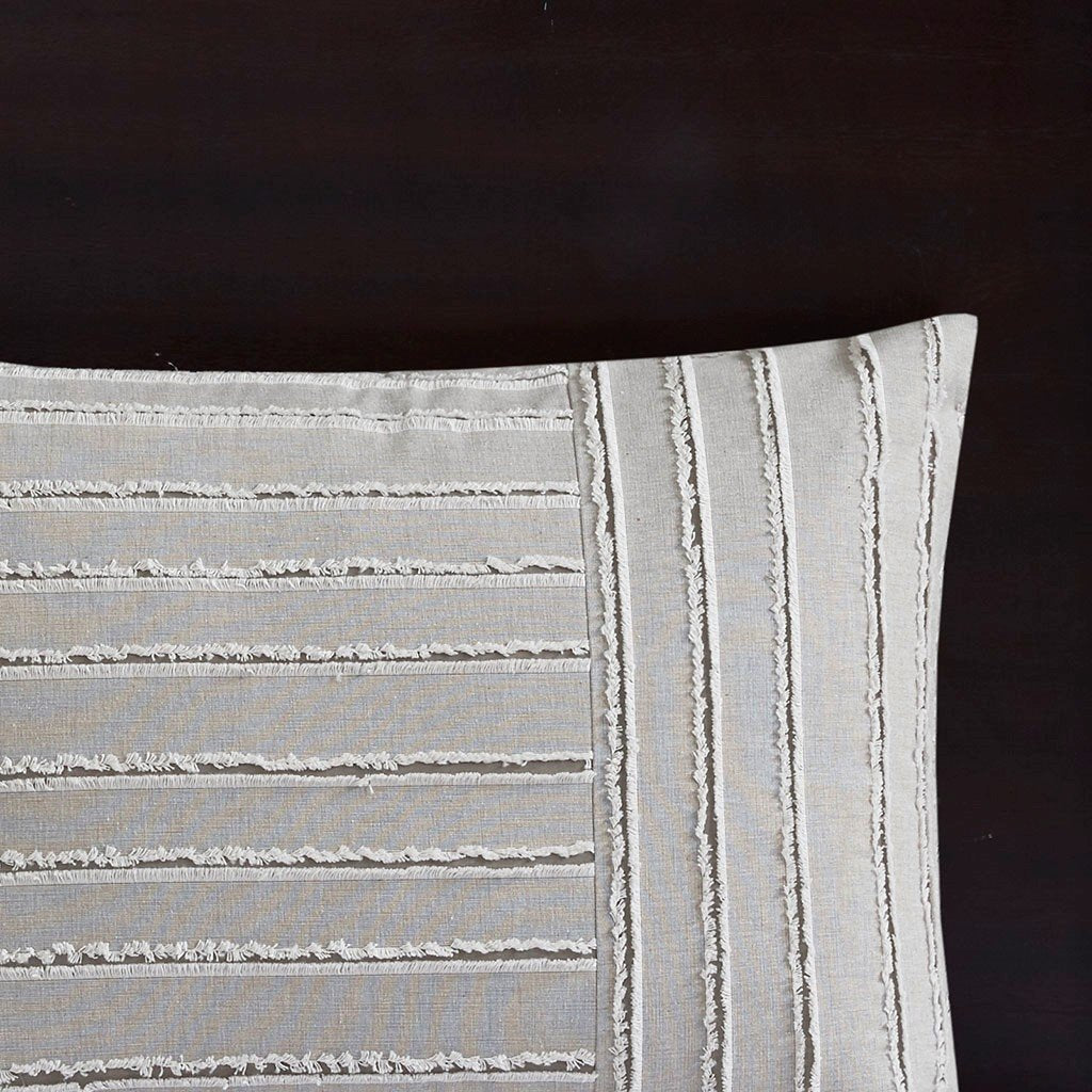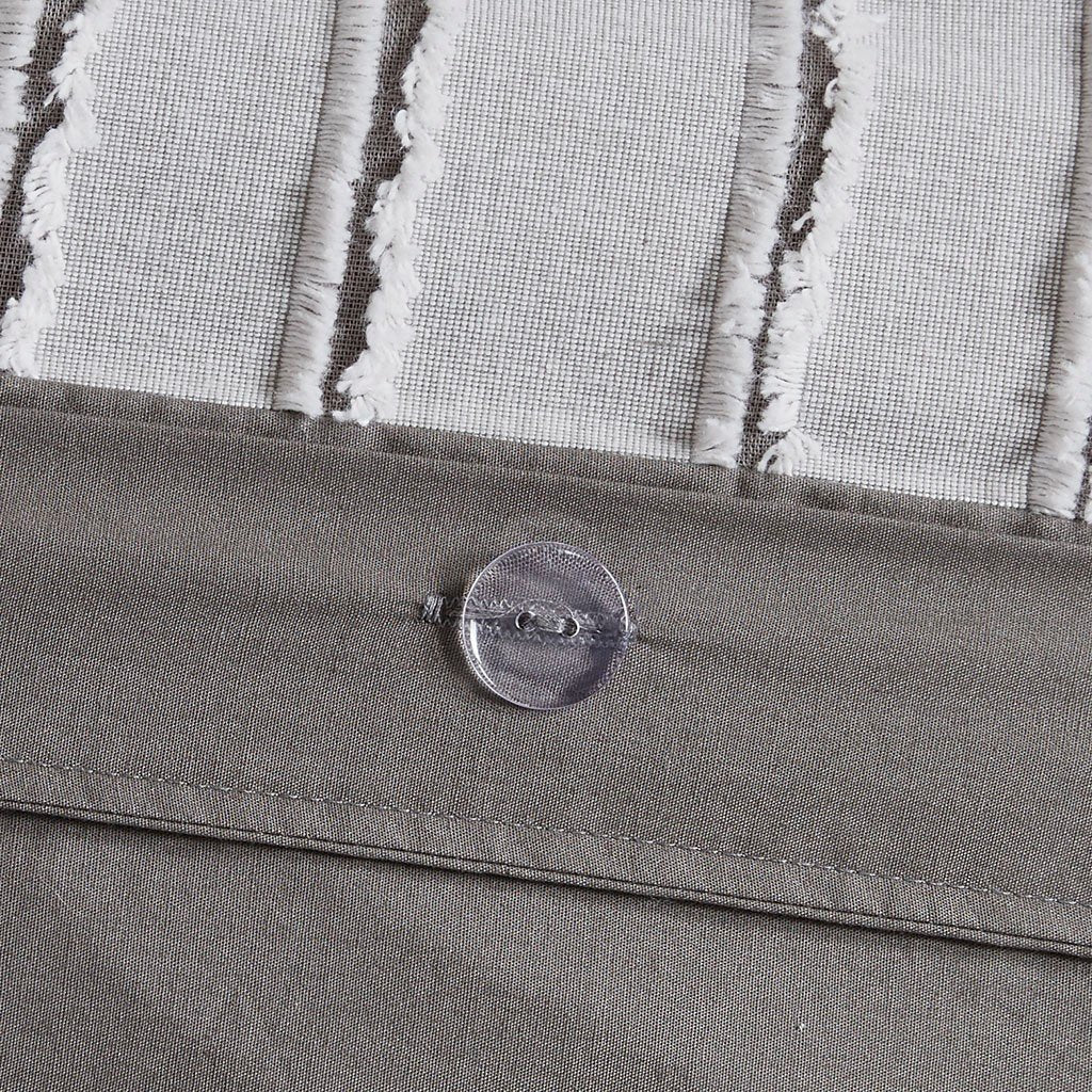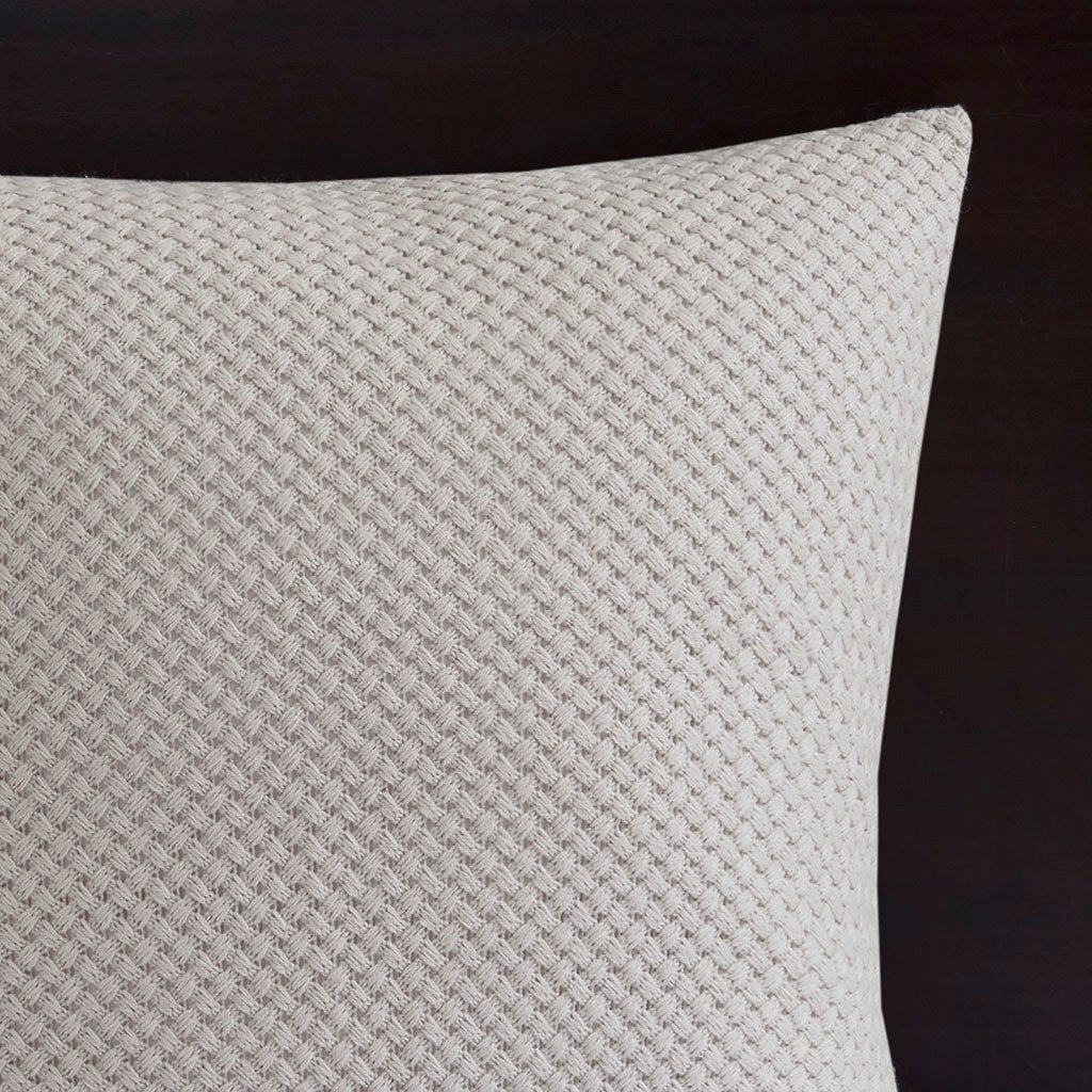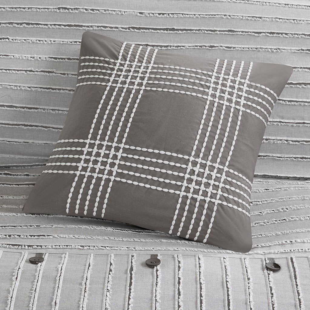Add a quaint farmhouse charm to your bedroom with the Madison Park Signature Essence Cotton Clip Jacquard Comforter Set. This cotton clip jacquard gray comforter features a pieced design with striped pattern and decorative buttons, for a casual look. Two matching shams and two coordinating Euro knit shams complement the top of the bed. Also included are three decorative pillows: one knit square, one trimmed square with embroidery details, and one carpet stitch oblong with decorative embroidery details that add the finishing touches to this set. The removable comforter filler is included, machine washable, and allows for easy cleaning while the comforter cover is dry clean only for best results.