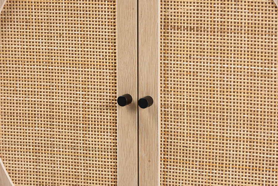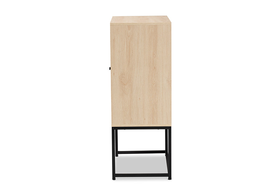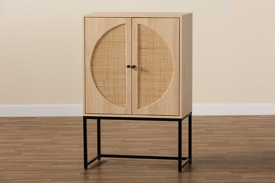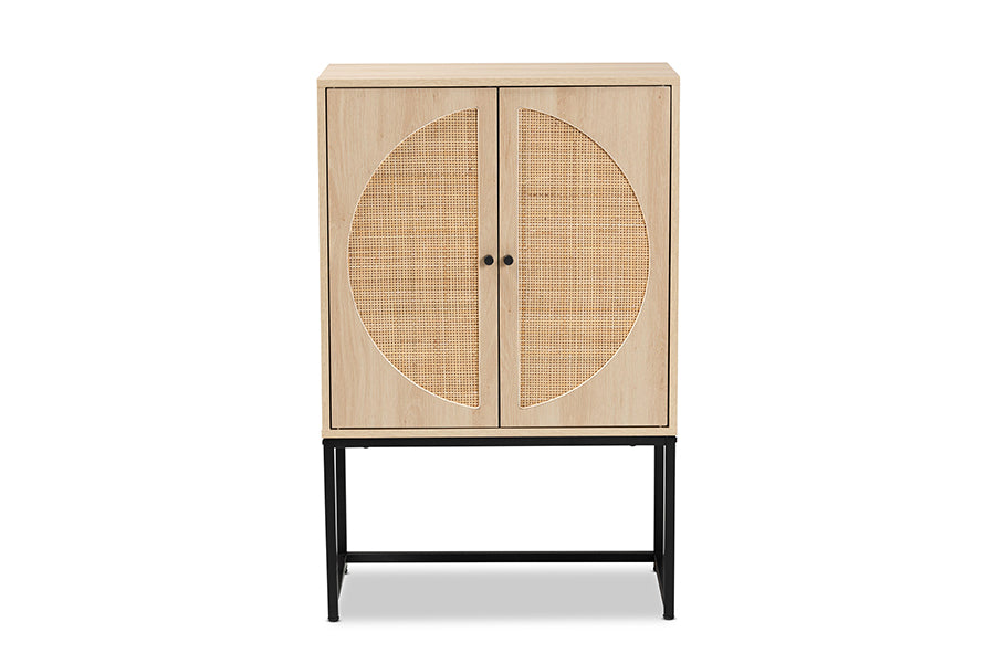 Baxton Studio Ardon Bohemian Light Brown Finished Wood and Black Metal 2-Door Storage Cabinet with Natural Rattan