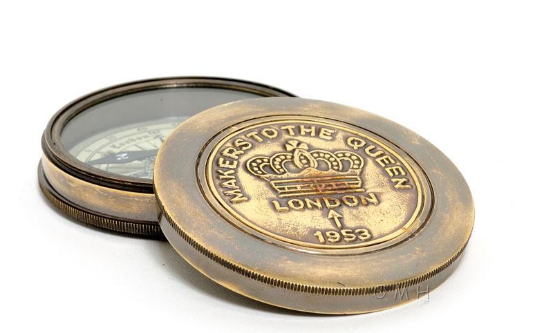 This is a fully functional replica of the Poem Compass made by "Makers to the Queen" 1953. Inside is a poem "The Road Not Taken" written by famous poet Robert Frost. It is made of high quality brass with each component is crafted using the finest craftsmanship. It comes with a detachable metal lid and a leather case. Available in antique brass finish. It is a great addition to any nautical collection. The item dimensions are: L: 3 inches, W: 3 inches, H: 0.8 inches.