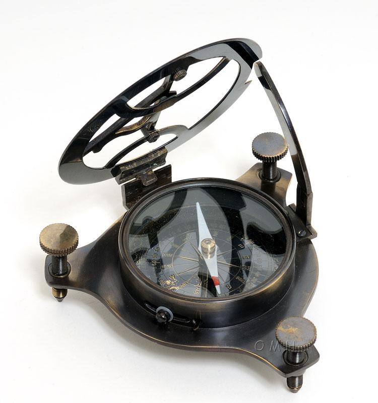 This is a fully functional sundial compass. It is made from high quality brass. Each component is crafted with the finest craftsmanship. It contains a foot screw and circular bubble for easy reading. The lid is fixed with a hinge. Available in antique brass finish and come with a beautiful rosewood gift box. This compass is a great addition to any nautical collection. The item dimensions are: L: 3.25 inches, W: 3.25 inches, H: 3.25 inches.