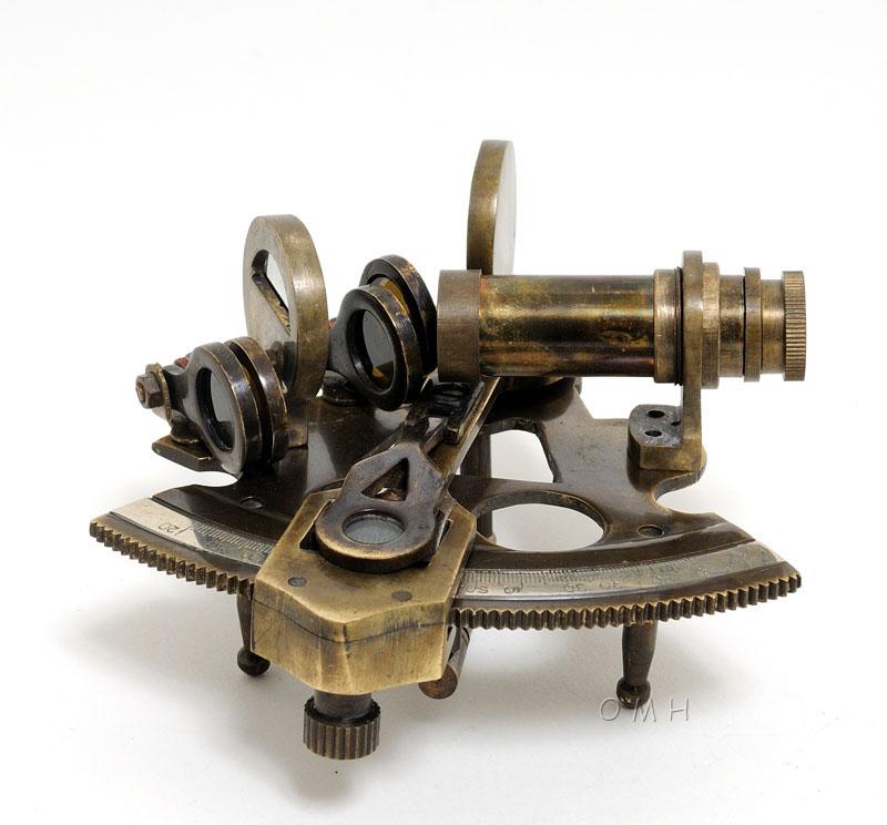 This is a functional replica of the nautical sextant. It is made of high quality brass. Each component is crafted with finest craftsmanship. Using rack and pinion mechanism, this sextant was given a heavy pattern of solid brass. Available in antique brass finish and it comes in a beautiful leather gift box. This sextant is a great addition to any nautical collection. The item dimensions are: L: 4 inches, W: 4 inches, H: 2.5 inches.
