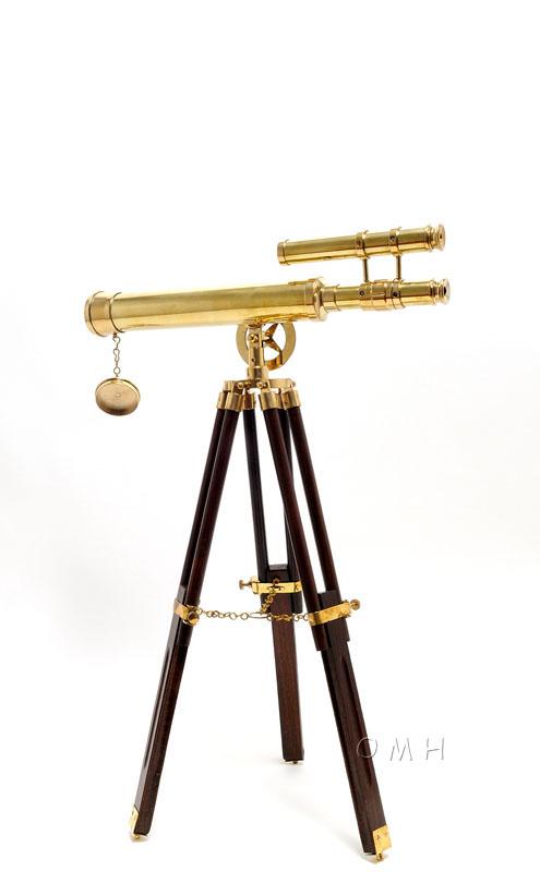 This is a functional replica of the harbor telescope. It is made of high quality brass finished with a bright shine. Each component is crafted with the finest craftsmanship. This double barrel telescope is fitted on a beautiful adjustable rosewood tripod. It is a great addition to any nautical collection or home decor. The item dimensions are: L: 18 inches, W: 2.25 inches, H: 26 inches w/stand.