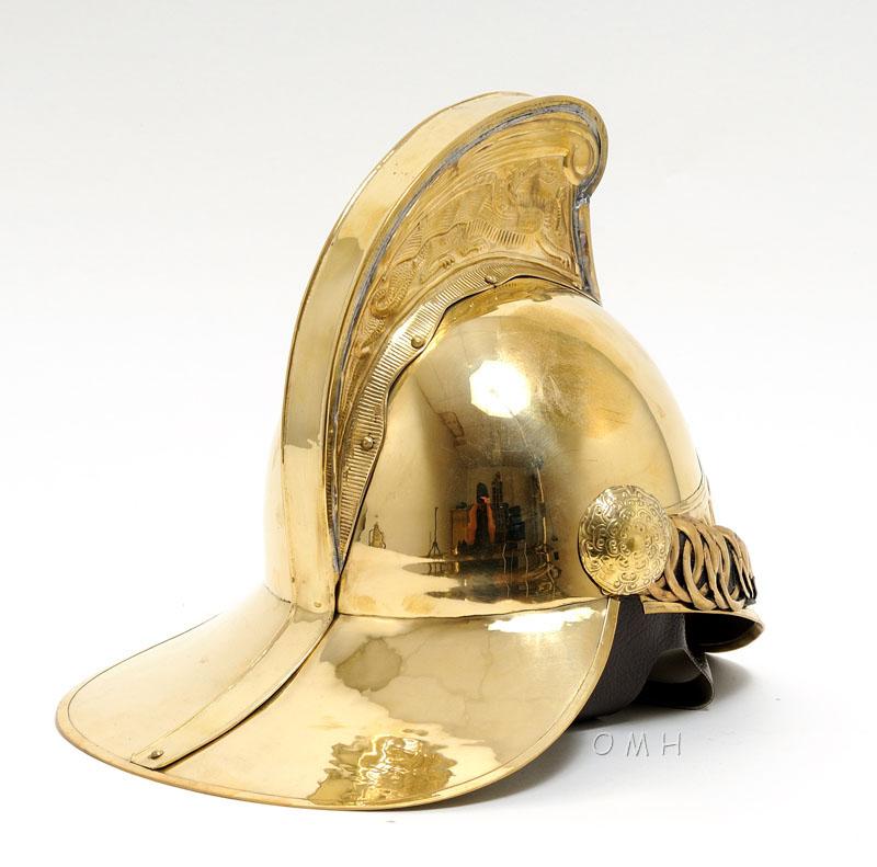 This is an exact reproduction of a brass Merriweather-pattern helmet from late Victorian England, used by the Fire Fighter Officers. It comes with very detailed brass dragon sculpture on the side and on top. Inside the helmet is a leather covering to provide comfort against the brass. Also comes with beautiful shiny brass chain. Its a great addition to any nautical collection. The item dimensions are: L: 12 inches, H: 10 inches, H: 11 inches.