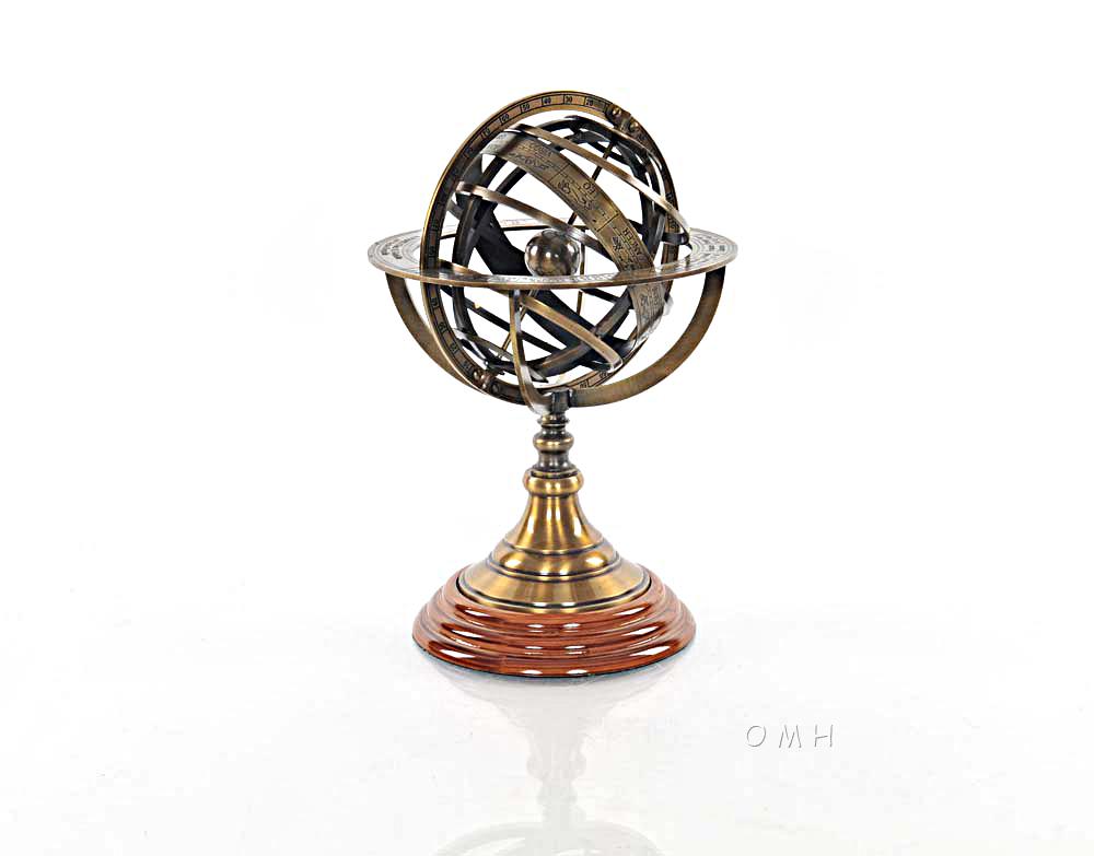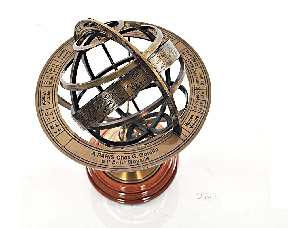 This is a replica of a European Demonstrational Armillary Sphere. It was used to measure the relationships of the objects in the sky. Each piece is made of finely crafted brass. It consists of a set of graduated rings representing circles on the celestial sphere. The brass sphere at the center of the armillary represents the Earth. The rims are marked "A PARIS Chez G. Gobille a P Ache Royalle." It features a rich antique finish that does not tarnish or show fingerprints. The heavy solid brass base is mounted on turned solid hardwood, and the bottom is covered with felt. Its a great addition to any nautical collection. The item dimensions are: L: 7 inches, W: 7 inches, H: 11.5.