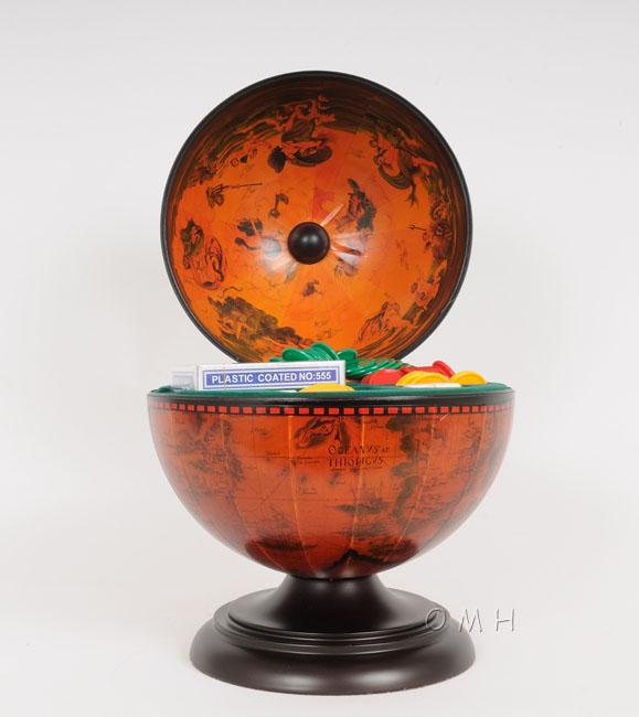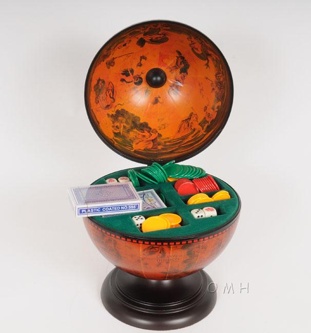 This is a beautiful globe poker set. It’s handcrafted from solid wood with a felt interior. This globe poker set will add style and flair to any poker set up. This globe poker set comes with two decks of playing cards, dice and lots of colorful playing chips.
