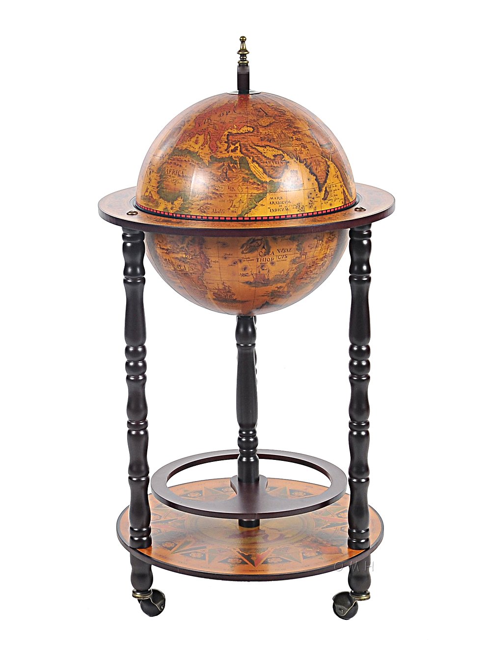 Featuring an old nautical map on its surface, the globe can be lifted to reveal the hidden drink cabinet and the highly decorated interior. Glassware and bottles can be placed at the bottom shelf as well as inside the globe. The cabinet is made of wood and painted in dark red mahogany. It comes with round carved wooden floor stands on the wheels. The globe overall dimension: 17"x17"x35". Some light assembly required.