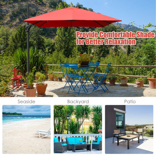 This offset patio umbrella is the great answer for bright and sunny days. Large canopy with air-vented design provides a shading place with a comfortable breeze. The combination of 360° rotation function and 4-level tilting system helps to block up the harmful sun lights from different directions. The hand-crank technology allows you to open and close the umbrella effortlessly and smoothly. Enhanced aluminum structure perfectly supports canopy ensuring high durability and extra sturdiness. A weighted base (not included) is necessary while using. You can place it in garden backyard and outdoor market for both residential and commercial use. If you are looking for an offset patio umbrella like this do not hesitate to place an order! Large shading coverage offers shady relaxation place 4-level tilting mechanism prevents sun lights from all directions 360-degree rotation is easy to adjust by foot pedal switch Hand crank system helps to open & close umbrella easily Enhanced aluminum frame ensures high durability & sturdiness Ideal for residential & commercial use in garden backyard market Easy assembly by detailed instruction saves time & energy The cross base should be used with a weighted base