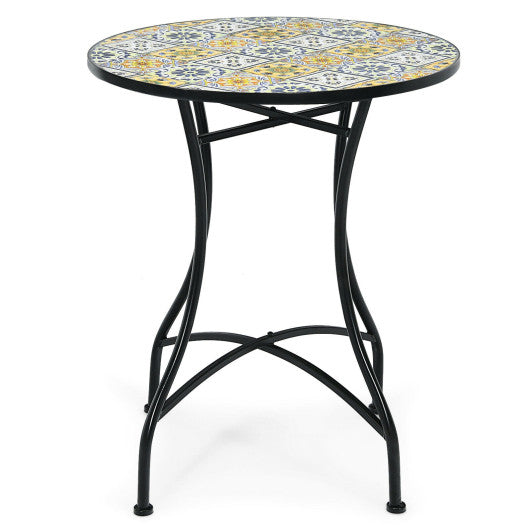 Want a table that combines practicability and beauty? Well then how about picking up this outdoor mosaic table? This round table is 24" x 28" (Dia x H) that is larger and taller than common products. Therefore no matter if you want to use it as an outdoor dining table or garden plant stand this practical table can always be suitable. What's more wherever you place this outdoor round table it will always bring a retro feeling because of its special mosaic tabletop with pretty floral patterns. Additionally the sturdy powder-coated and rustproof steel frame with anti-slip foot pads makes this mosaic round table stable and durable. If you are looking for such a table do not hesitate to buy it! Lighten up your outdoor space with retro mosaic design Beautiful floral pattern for an extra timeless addition Convenient to clean with ceramic tile tabletop Sturdy powder-coated and anti-rust steel frame for 110 lbs strong loading capacity Avoid scratching the floor while adding additional stability with anti-slip foot pads Can be used as an outdoor dining table or plant stand for different needs Suitable for patio garden balcony backyard and living room etc 3 steps for quick installation