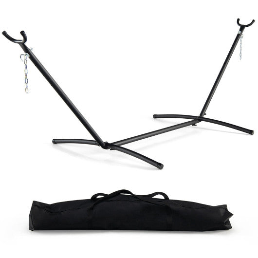 Enjoy a wonderful holiday with this hammock chair stand! Crafted of a powder-coated steel frame the hammock stand features great sturdiness and strong weight capacity. This hanging chair stand with 6 optional heights perfectly fits hammocks that measure 8ft to 10.5ft in length. In addition the stand works well with Brazilian curved and spreader bar hammocks making you freely use it in accordance with your needs. With a carrying bag you can bring the hammock stand from yard to beach allowing you to enjoy the comfort anywhere. Complete accessories are included which makes it easier to assemble and disassemble the frame without tools. If you are looking for such a product do not hesitate to take it to your home! Accommodate hammocks from 8ft to 10.5ft in length Available in 6 adjustable heights for more choice Powder-coated steel frame accounts for high reliable structure Work great with Brazilian curved and spreader bar hammocks Bear up to 450 lbs suitable for 2 adults to sit together Safety hooks can firmly fix hanging chairs to the stand Non-slip foot pads prevent the floor from being scratched Great addition for indoor yard garden patio and beach etc Comes with a carrying bag for easy storage and transportation Easy to assemble and disassemble the frame Hammock stand only