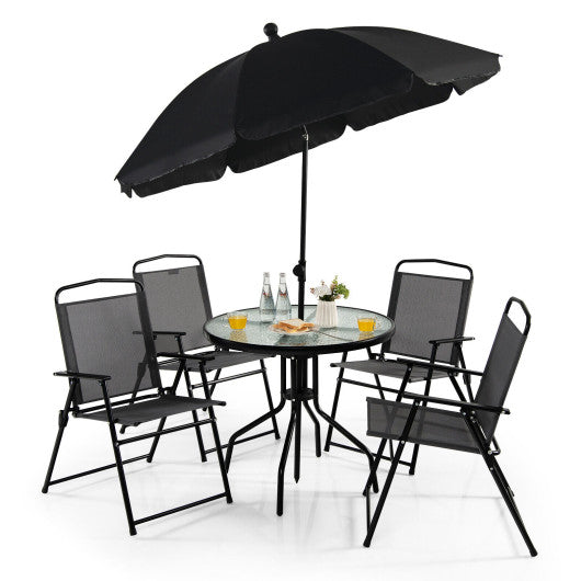 6 Pieces Patio Dining Set Folding Chairs Glass Table Tilt Umbrella for Garden-Black