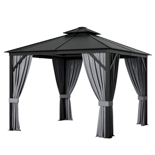 Enjoy Your Outdoor Leisure Time! The 10' x 10' x 9' (L x W x H) hardtop gazebo provides enough room for your outdoor furniture whether meeting friends enjoying afternoon teas enjoying meals or having BBQ parties it can be a perfect choice. The double-roof design ensures enough air circulation while improving stability in windy conditions. And thanks to the top concealed mesh there is no need to worry that the "unwelcomed guests" would come into the gazebo from the top air vent. Besides the permanent gazebo is designed with netting and curtains to protect you from insects rain and ultraviolet while adding more privacy. More importantly instead of using a fabric polycarbonate top this patio gazebo adopts galvanized steel hardtop which is not only fade-resistant and ultraviolet-resistant but also sturdy enough to withhold strong snow and wind. Also the aluminum frame and 4 reinforced corners add more durability and safety. This double-top gazebo is aim to create a comfortable and relaxed outdoor area for you and your family! (Note: you may receive 3 packages at different times) If you are looking for such a product do not hesitate to take it to your home! The galvanized steel roof is weather-resistant and durable and can be used for all seasons The parallel strips roof design promotes drainage and reduces the hassle of rain and snow The aluminum supporting frame and poles are not easy to rust peel or chip and are sturdy enough The anchoring screws help fix the gazebo on solid ground for better wind resistance The double-roof top with concealed mesh promotes airflow and adds wind resistance The inner netting and outer curtains can be fixed by loop straps and can also be detached The breathable mesh netting prevents “unwelcomed guests” away while promoting ventilation The zippered curtains provide enough privacy and protect you from rain and ultraviolet Installation guide