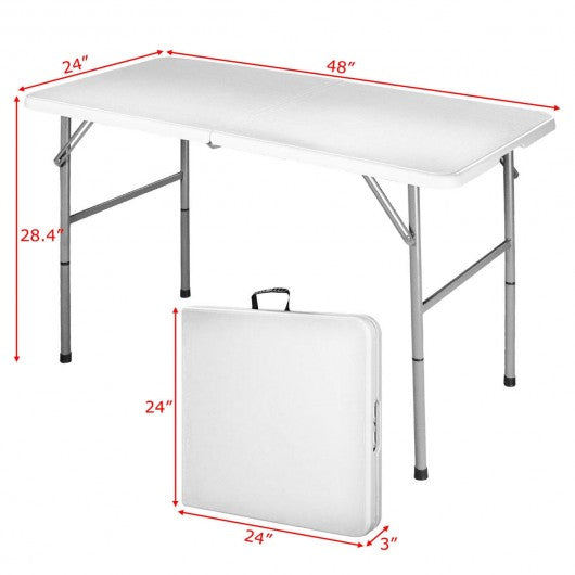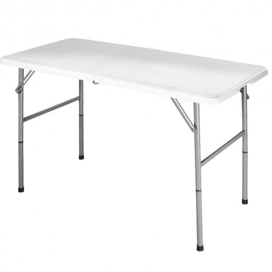 The camping table is multipurpose and easy to carry. This is 4' folding table portable multipurpose fold in half table which is ideal for family reunions picnics camping trips buffets or barbecues. The folding table is of HDPE table top powder coated steel frame. So it resists spills and weather and sturdy easy to clean. Because of its foldable top and legs it can save space and time as well as convenient to transport and store. Buy it enjoy your family reunions picnics camping trips buffets or barbecues! Brand new and high quality Legs can be locked into a fixed position for stability Durable nylon adjustable glides protect floor surfaces Portable design fold and set for use quickly and easily Coated steel frame for stability Easy to clean top