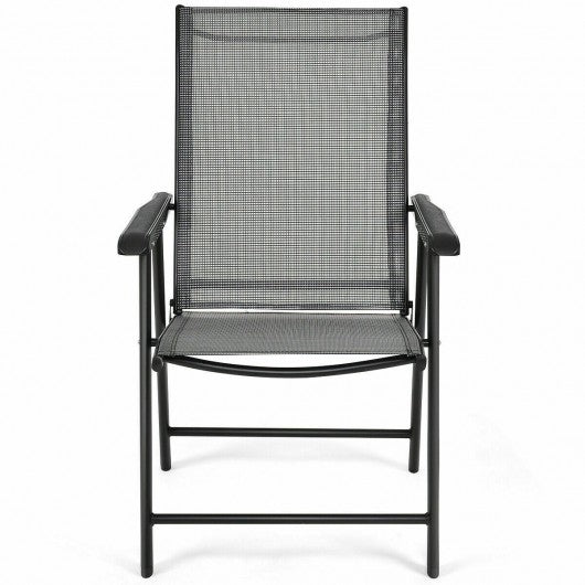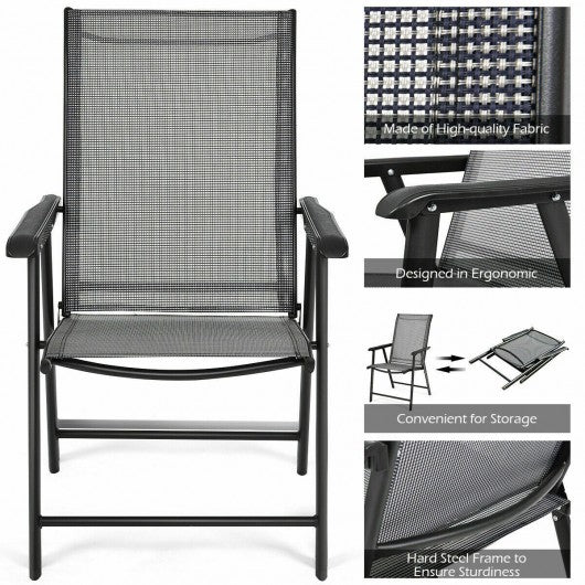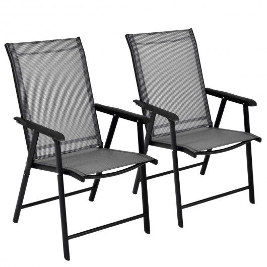 Specification: Color: Black Material: Steel textilene Overall dimension: 27" x 23" x 37" (D x W x H) Net weight: 10.5 lbs Package includes: 2 x Foldable chairs