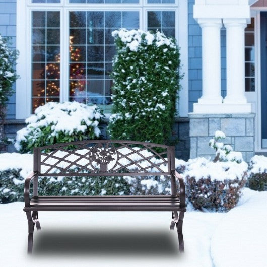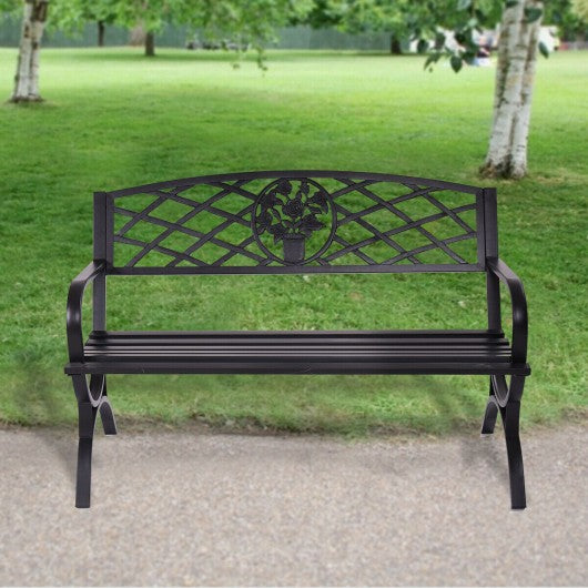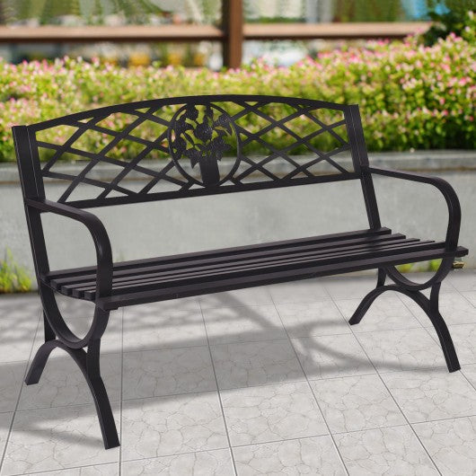 The 50" steel frame garden bench is a great place to sit and rest on while enjoying the outdoors. Made of metal slats this bench is sturdy yet comfortable enough to relax on in the sun and durable for long life span. The seat is composed of 6 steel slats to provide support. The black color gives the bench a modern look that will fit perfectly with any outdoor décor. This bench is a perfect gift for those who want to relax in the garden! Don't hesitate to buy it! High quality and brand new Constructed with high quality and sturdy metal Strong sturdy and comfortable to seat Seat is wide enough for 3 persons With armrests Four solid legs provide safe place to sit and relax Modern style fits with any backyard or home Perfect for garden park deck porch backyard or pools