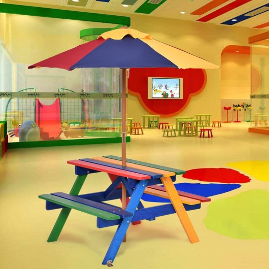 This table can not only be as a picnic table but also a play table and beach table. It is easy to set up and take down it is absolutely an ideal portable table! Constructed from premium eco-friendly natural fir wood it is secure for kids to us. This picnic table is stable and sturdy in structure with good load-bearing and not easy to damage. Four children can sit comfortably for social play and interaction. With an umbrella canopy this picnic table is perfect for your kids to enjoy their meals or snacks outdoors. Give your child a personal space in your backyard to eat play and relax with this table set. Don't hesitate to buy it! Premium eco-friendly natural fir wood is safe and secure for kids to use Stable and sturdy in structure with good load-bearing not easy to damage Umbrella made from premium polyester fabric is wear resistant and built to last Umbrella canopy design to protect kids from rainy days or harmful ultra-violet sun rays Featuring 2 benches for 4 seats available holding up to 88lbs per bench Colorful appearance design will be attractive for kids Rounded edge design can prevent kids from potential injuries such as accidental bumps Smooth wooden desktop with strong wear resistance for easy cleaning and maintenance All accessories and clear instructions included for easy assembly or disassembly Provide kids a great place to share their happy time and enjoy a snack indoors or outdoors Ideal for kids eating meals playing games working on homework and more