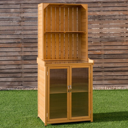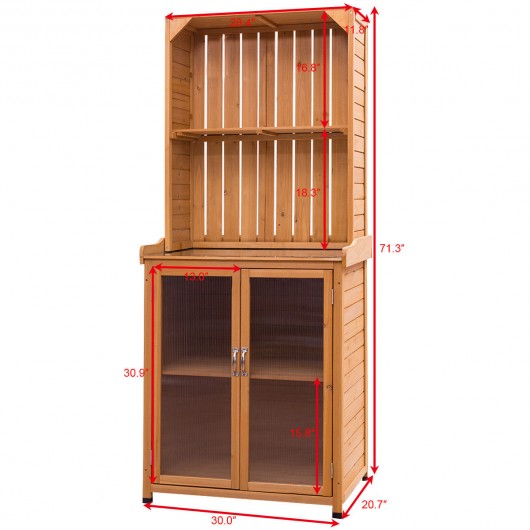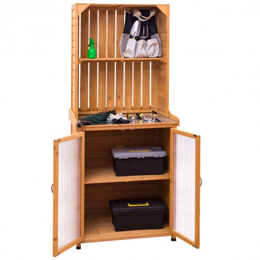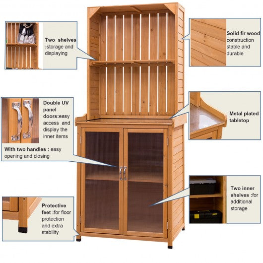 This is elegant wooden garden shed which is constructed from durable and solid fir wood. This sturdy shed is weather resistant and designed to withstand the harsh elements. Galvanized metal plated tabletop is durable easy to clean and gives you ample space for all your gardening needs. Two doors at the bottom with shelf allow you to create the perfect storage area to meet your requirements making your items more organized.The perfectly designed will help for garden tools. If this is just what you are looking for don't hesitate to buy it now! Brand new and high quality Made from solid wood construction is very durable and sturdy Double UV panel doors cupboard for storage and display two inner shelf for additional storage Sleek potting bench for the modern gardener. Ideal choice for contemporary landscapes Metal plated tabletop is durable easy to clean and gives you ample space for all your gardening needs Eliminates clutter so you stay inspired and focused Use outdoors or inside Assembly required