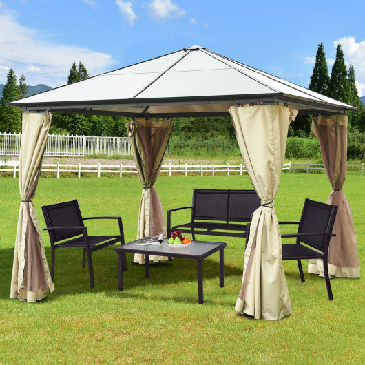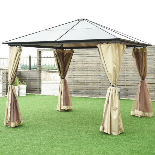 It combines the durability of a powder coated aluminum construction with a hard polycarbonate top that keeps rain out while letting fresh air in through a vented top. Two layers of curtain design satisfy your demand for outdoor activity protecting you from mosquito. This is a great place you can sit under this canopy tent and enjoy your leisure time. You can use it to carry out a lot of outdoor activities such as having outdoor parties playing games with your kids having a picnic and so on. It is really a very good outdoor companion to you. Don't hesitate to buy one! High quality and brand new Solid aluminum frame durable and sturdy Beautiful design and appearance Nice-looking decorative patterns 160 g grey polyester fabric easy to clean Equipped with mosquito net preventing you from mosquito A perfect cover to keep out the UV and rain 4 metal leg adding support to the gazebo against windy conditions A hard polycarbonate top Large space Practical and useful Perfect outdoor companion A wonderful shelter for outdoor life Adds up to enjoyment Bring you a happy mood Assembly required