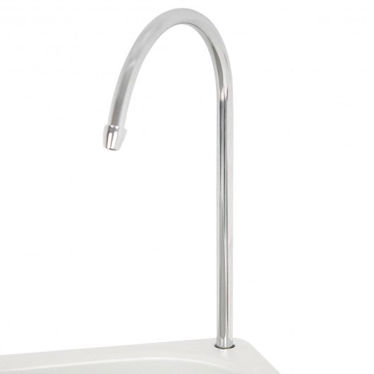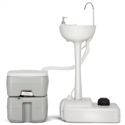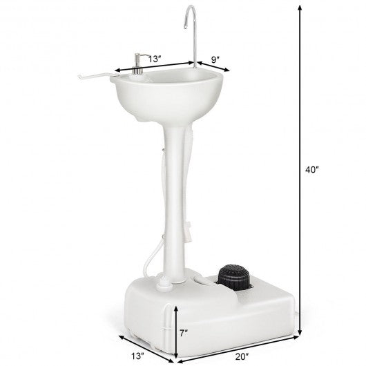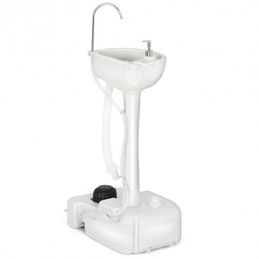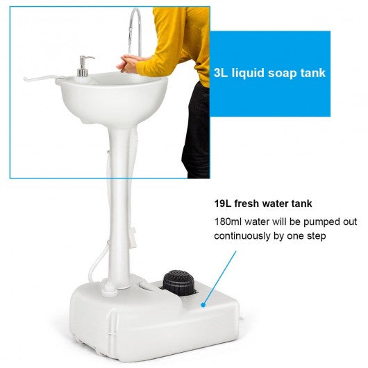 This is the portable camping sink which is perfect for outdoor social events family gatherings outings camping boating or any outdoor activity. Are you looking for a portable handwash sink? our portable camping sink is a great choice for you. It's perfect for outdoor social events family gatherings outings camping boating or any outdoor activity. The portable handwash station helps you keep your hands and food clean while camping or handling food in an event. With built-in wheels for easy moving and hands-free faucet that uses a foot-operated pump to provide a stream of water. Includes a dispenser for hand sanitizer or liquid soap and a towel rack which adds up to its convenience! Meanwhile adopting high quality hdpe material it's sturdy and durable for a long term use. Additions ensure you're able to maintain a healthy level of hygiene no matter where you are! This is the portable camping sink. Don't hesitate to buy it. High quality eco-friendly HDPE plastic With 19L ( 5 gallons ) large water capacity Features a hands-free operation by stepping on the foot pump to provide a stream of water Each pump dispenses out 180mL of water Provide more than 100 washes by a single fill-up Equipped with a towel rack you can hang towel or roll paper Soap tank can hold up to 3L of liquid soap and includes a 1ml soap dispenser Equipped with flexible hose for draining Used water can be collected for reusing for environmental protection Used independently or cooperated with toilet or water tank Easy to carry with light weight and has rolling wheels to transport Perfect for RV camping hiking hunting BBQ or other outdoor activities Easy to assemble according to our instruction No tools required for the installation Base tank can be fixed on ground through four holes at the corner if necessary Pegs are not included