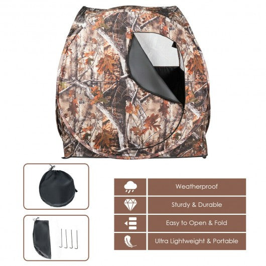Specification: Color: Camouflage Material: 150D PU coating fiberglass mesh Overall dimension: 53"L x 53"W x 53" H Window size: 51"L x 25"W Backpack dimension: 20.5"L x 20"W x 3.5"H Net weight: 6 lbs 1-2 Person capacity Package includes: 1 x Hunting tent 4 x Ground nail 1 x Backpack 1 x User's manual
