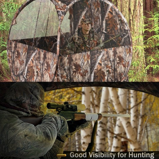 Thanks to the camouflage pattern that blends easily with the natural environment the prey won't notice you making your hunting experience more enjoyable. Three large mesh windows allow you to have a broader view and more clearly discover the dynamics of wildlife. With the waterproof PU coating you will not have to worry about getting wet even on rainy days. The sturdy fiberglass frame and the included nails allow you to safely continue hunting watching and photographing animals in harsh environments. The foldable and portable design saves you time and effort. Our hunting tent is the perfect choice for your outdoor activities. If you are looking for it don't hesitate to buy it! 3 large and breathable mesh windows allowing you to have a nice view of the outdoors Camouflage patterns make the prey unaware of your presence Waterproof fabric provides you with a dry hunting environment Made from a sturdy fiberglass frame making it not easy to deform Multiple triangular fabrics make the hunting tent tear-resistant and durable It can be folded in a matter of seconds saving you valuable hunting time The lightweight design with a backpack makes it easy to carry and store It contains 4 ground nails to help enhance stability Ribbon rings on the surface of the hunting tent allow you to tie the ropes with ease