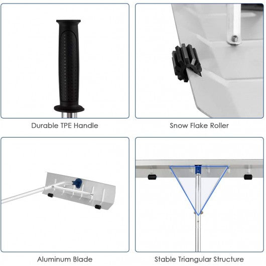 This roof rake will make it easier to remove snow piles of branches wet leaves and dust from your roof while standing safely on the ground. It is lightweight and portable so that it can effectively reduce the pressure on your back and shoulders when in use. Besides made of high-quality aluminum materials the roof rake is durable enough to provide you with long-term use. The soft TPE handle which is equipped with the anti-skid design will help you hold it more effortlessly. The unique snowflake roller designs minimize the damage to the roof. So why not place an order and buy it now! Snowflake roller design will not cause any damage to your roof Adjustable length ranges from 5' to 20' Equipped with a high-quality aluminum blade The steady aluminum tube will not get easily damaged The strong support rods ensure its stability Not only can you use it to remove snow but it can be used to remove branches and leaves Lightweight and portable ensuring long-term service life