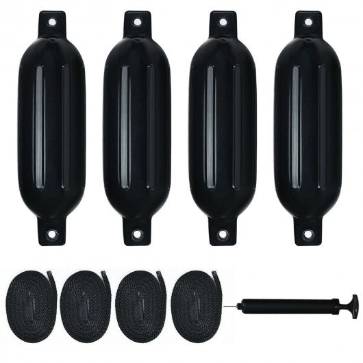 Specification: Color: Black/navy/white Material: PVC Fender size: 27" x 8.5" Fender lines length: 6' Net weight: 16.5 lbs Package includes? 4 x Boat fender 4 x Fender lines 1 x Inflator