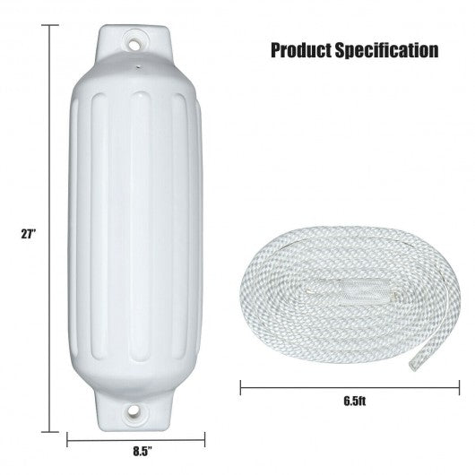 Specification: Color: Black/navy/white Material: PVC Fender size: 27" x 8.5" Fender lines length: 6' Net weight: 16.5 lbs Package includes? 4 x Boat fender 4 x Fender lines 1 x Inflator