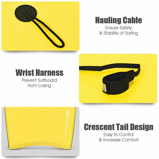 This is the bodyboard which can give you a cool and wonderful experience of riding a wave on a hot summer day. The crescent tail has great flexibility and comfort to suit your different riding styles. Made of high-quality EPS core XPE deck and hdpe slick bottom it has strong buoyancy and load-bearing capacity. Moreover it has good impact resistance and weather resistance making it difficult to deform and fade. The most important thing is that it has a leash and a wristband that protects you from being washed away by the waves. The light weight is easy to carry and transport so you can take it to the pool water park river and sea. What are you waiting for? come and enjoy the water sports! Not easy to break or deform due to the durable EPS core Waterproof xpe deck has good impact resistance and durability Smooth hdpe bottom greatly reduces the friction during surfing Ultra-light in weight makes bodyboard very easy to carry wherever you go It has excellent buoyancy and strong load-bearing capacity Leash and wrist rope design improves safety and stability during surfing The bodyboard has 60/40 rails rear channels and a crescent tail Bright colors and stylish design attract attention from the seaside Suitable for water sports giving you a wonderful outdoor surfing experience
