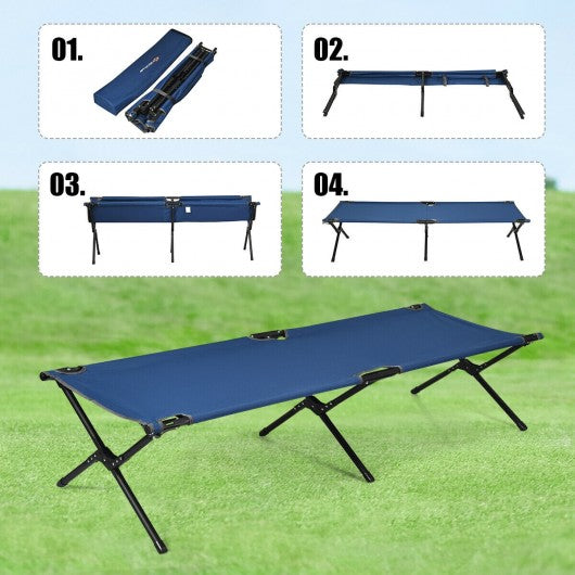 The tear-resistant 600D oxford fabric provides a comfortable and stable bed to overcome the environment limitation. This portable sleeping cot features a sturdy iron frame with X-shaped legs which can hold up to 300 lbs. With compact folding size & portable carry bag with handle the military camp bed is easy to fit into your camping trunks and save large space. Also this cot bed is easy to set up and fold down into a compact size for ease of use when camping hiking fishing or traveling. Besides you can use our camp bed for a nap in the office. If you are looking for a bed like that don't hesitate to buy it. Iron X-leg design to reinforce the cot and provide high stability Non-slip feet design for stable and safe whole construction Heavy-duty 600D oxford fabric to ensure comfort and safety Sturdy iron tube and frame structure allow it to withstand a weight of 300lbs Folding design and a carry bag for easy to transport and storage Perfect for adults or children campers explorers or unexpected house guest Widely used for camping hiking mountaineering or used in offices