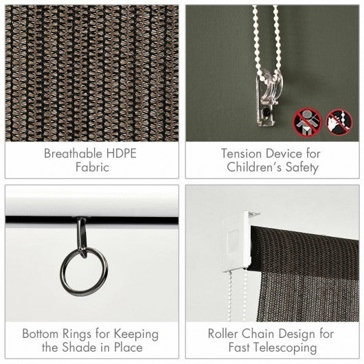 Made of solid aluminum frame and HDPE fabric this roller blind is sturdy and durable for long time use. 180G high density polythene fabric can reduce the harsh glare and provide you with softer light and cooler temperature. Besides with the well-designed bead chain and rings at the bottom the roller shade is easy to operate and fix. And the simple design can match well with outdoor and indoor d�cor. It's really functional and will be a good choice for you. According to detailed installation instructions this shutter can be installed in different ways to meet your different needs. If you are looking for roller blind like that don't hesitate to buy it. Durable shutter with 5-year aging protection With the semi-shut design will not block out all the light Sturdy aluminum tube provides strong support Weather-resistant HDPE fabric offers sun shade and reduces heat Well-designed bead chain and can easily roll and unroll the shade Ring at the bottom prevent rolling curtain from moving Fashion and versatile roller shade is suitable for various space Easy and quick to assemble with the hardware and instructions