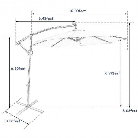 Specification: Color: Beige/tan/orange/burgundy Material: Steel aluminum polyester fabric Overall dimensions: 10" x 7.5" (L x H) Net weight: 30 lbs Number of ribs: 8 Number of lights: 24 Package includes: 1 x 10ft solar powered offset umbrella with cross base