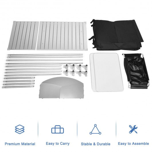 Equipped with 2 shelves storage space and large countertop this portable grill table owns the large storing capacity for various condiments and cooking utensils. And the detachable water basin on the side facilitates the outdoor washing experience. Made of high quality steel frame and oxford fabric the kitchen station is sturdy and durable for outdoor use. All parts are packed in the carrying bag perfect for outdoor activities like camping spring outing etc. With the detailed user manual you also won't find any difficulty assembling the grill table. If you are looking for such product don't hesitate to buy it. 2 shelves storage space and large countertop greatly enlarge the storing space Tabletop with windscreen for more effective burning Detachable water sink facilitates the outdoor washing experience Premium aluminum and steel structure is stable and firm Large heat-resistant tabletop for most stoves and coolers Packed in the a carry bag weighs only 23 lbs convenient transportation Edge corner with protective cover protecting your kids from being hit Compact size store neatly in your trunk PP sleeve to prevent the table from skidding Easy to assemble with the detailed user manual Perfect for picnics backyard barbecues tailgating parties or an overnight hit outdoors