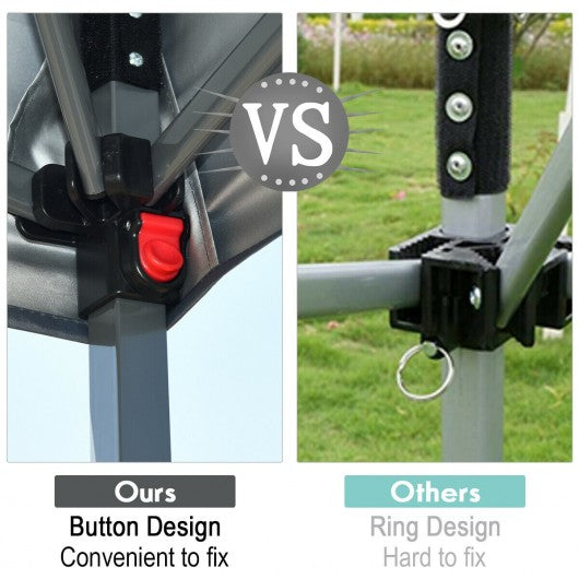 The folding tent which can be conveniently stored in a portable bag to carry and perfect for many outdoor activities like parties camping flea markets etc. Are you finding a foldable canopy to provide shelter for some outdoor activities? constructed of powder-coated solid steel the frame of the tent is rust-resistant and can provide long time service. And the height of canopy can be adjusted in three positions to meet your different needs. The wind ropes stakes and sandbags which come with tent can also add stability of tent. Whether the weather is rain or shine this outdoor shelter is sure to make your outdoor gathering pleasant. Under the canopy there is enough space for you to place furniture like deck chair table and loveseat to enjoy leisure time with your family or friends. If you are looking for such product don't hesitate to buy it. Sturdy steel frame ensures stable frame of canopy Adjustable height with three positions Pop-up design for easy installation Stakes rope and sandbag add additional stability of canopy Drain hole on the top of the canopy Equipped with a wheeled bag for easy carrying and transport Side pocket of wheeled bag for storing some small accessories Enough shade for you to have outdoor activities