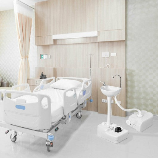 The portable sink is perfect for outdoor events garden gatherings or indoor etc! Premium HDPE makes sure its firmness and durability. Thanks to its lightweight and wheels at the bottom you can carry it effortless. With 4 holes the hand sink can be fixed on the ground for better stability. In addition you can get water by stepping on the pump to make hands free. This portable hand sink with towel shelf and storage platform offers great convenience for you. Besides it comes with a sewage tank to collect dirty water being friendly to the environment. If you are looking for such hand wash station why not have a try? Completely self contained no external water or power connections Hand-free operation beneficial for personal hygiene 4.5 gallon fresh water tank can provide more than 100 washes Made of premium HDPE wear resistant and durable for use Comes with 4 holes to be fixed on the ground for better stability Rough texture on pump to be anti-slip A 0.8 gal liquid soap dispenser to be used for a long time Lightweight and wheels easy to carry and move Telescopic hose makes drainage splash-free Rotatable towel shelf to hold towels or tissues Used independently or cooperated with portable toilet or extra water tank. Easy to assemble with no tools